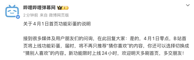 在3月31日的夜晚,知名视频平台哔哩哔哩对外发布了一则引人注目的公告。公告中透露,自4月1日零时起,B站的首页将迎来一项别具一格的功能彩蛋——除了原有的“猜你喜欢”内容推荐外,用户现在还可以轻松切换至“猜别人喜欢”的内容展示模式。值得注意的是,这项新功能将以限时的方式呈现,仅持续24小时,为平台用户带来一场别开生面的体验。 |
