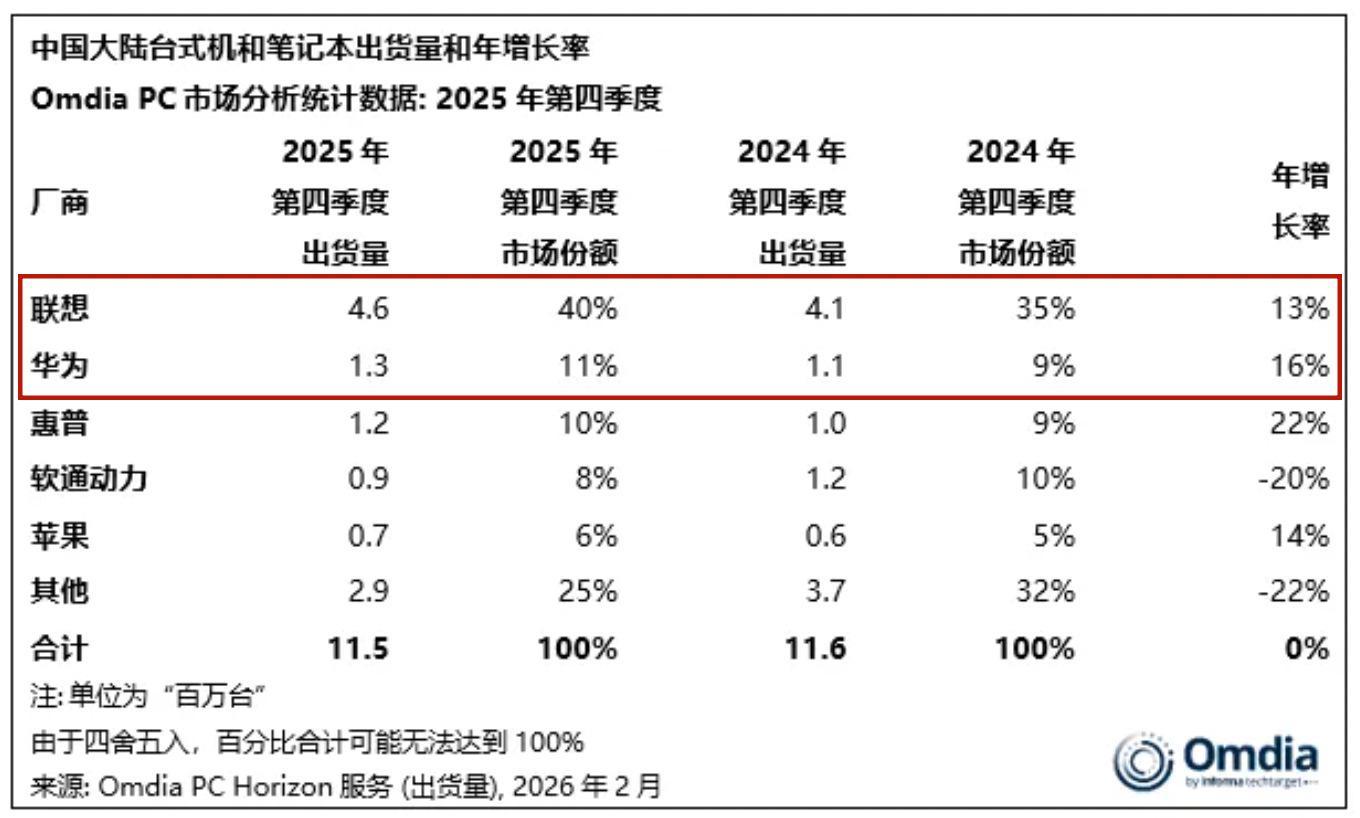 徽声在线记者 | 宋佳楠 4月2日,权威数据机构Omdia发布的最新市场研究报告显示,2025年第四季度中国PC市场整体出货量达到1150万台,与去年同期相比基本持平。这一数据背后,消费端需求的疲软与商用、政府采购需求的强劲增长形成了鲜明对比,市场结构正加速向多元化分化。 在品牌竞争格局方面,华为凭借130万台的出货量、11%的市场份额,稳居国内PC市场第二位,同比增速高达16%,再次实现了对联想的增速反超。这一成绩不仅标志着华为PC业务已彻底走出调整期,更预示着中国PC市场正从单纯追求规模扩张转向更加注重价值创造和差异化竞争的新阶段。