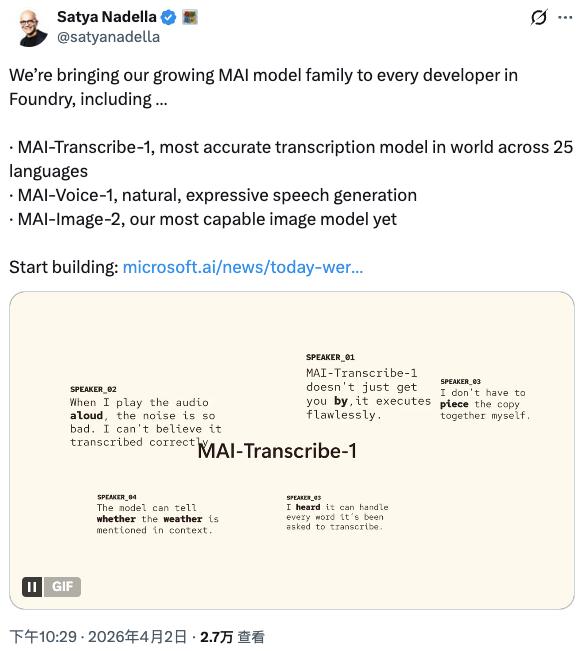 徽声在线4月3日消息(编辑 史正丞)美国科技巨头微软在周四正式对外宣布,其内部研发的三款AI模型已开启全面商业化应用,这一动作标志着微软正逐步减少对长期合作伙伴OpenAI的技术依赖,加速构建自主AI技术生态。 据微软AI超级智能团队披露,此次推出的MAI-Transcribe-1、MAI-Voice-1和MAI-Image-2三款模型,分别聚焦企业AI领域三大核心场景——语音转录、语音合成与图像生成,旨在通过垂直领域的技术突破提升商业竞争力。 <(微软CEO纳德拉通过社交平台X宣布模型商用,图片来源:X) 在语音转录领域,MAI-Transcribe-1展现出显著优势。微软公布的测试数据显示,该模型在多语言混合测试中平均错误率仅为3.9%,较OpenAI的GPT-Transcribe(4.2%)和Gemini 3.1 Flash(4.9%)更具准确性。这一突破或对会议记录、客服对话等场景产生深远影响。 语音合成方面,MAI-Voice-1通过算法优化实现技术跃迁。该模型可在单块GPU上实现60秒音频的实时生成,且在长文本合成过程中保持声纹特征的高度一致性,为有声书制作、虚拟主播等场景提供高效解决方案。 图像生成模型MAI-Image-2自3月19日首发后,此次同步开启商用。根据「大模型竞技场」最新排名,该模型在文生图领域位列全球第三,仅次于谷歌Nano Banana 2和OpenAI的GPT-Image 1.5。值得注意的是,其文本输入成本仅为每100万词元5美元,图像输出起价为每100万词元33美元,较谷歌Gemini 3 Pro(120美元)和Gemini 3.1 Flash(60美元)具有显著价格优势。 战略转型:2027年剑指AI技术自主化 微软此次技术突围源于2023年10月与OpenAI的协议重组。新协议赋予微软独立开发通用人工智能的权利,而此前条款曾限制其构建竞争性系统。这一转变为微软AI超级智能团队铺平道路,该团队由谷歌DeepMind联合创始人穆斯塔法·苏莱曼领衔。 苏莱曼在战略发布会上明确表示:团队目标是在2027年前实现「真正达到世界前沿水平」,构建覆盖文本、图像、音频的多模态大模型体系。为实现这一目标,微软已启动算力基础设施升级,自2023年10月起部署英伟达GB200芯片集群。 「从芯片部署到模型训练,我们将在12至18个月内完成关键能力跃迁。」苏莱曼透露,微软正构建「前沿规模」的计算架构,为训练十亿级参数模型提供支撑。 这位2024年加盟微软的AI领军人物,此前主导了消费产品线的AI融合战略。随着2023年11月全面接管AI超级智能团队,苏莱曼在2024年3月的内部重组中将职责聚焦于模型开发,而企业级Copilot助手产品则交由前Snap高管雅各布·安德里欧负责。 苏莱曼强调:「未来三到五年,推进自主AI能力建设与实现技术独立是我们的核心战略。这既是技术突破的必然选择,也是应对2032年OpenAI知识产权授权到期的风险对冲。」不过他同时表示,微软将继续托管第三方模型,构建开放技术生态。 尽管战略目标清晰,但微软自研模型仍面临诸多挑战。以MAI-Image-2为例,该模型目前仅支持1:1标准画幅,缺乏横向/竖向比例调节功能,且不具备图像编辑、参考图生成等进阶能力。MAI-Transcribe-1则存在发言人区分、上下文理解等短板,微软承诺这些功能正在开发中。 行业分析师指出,微软的AI自主化道路既充满机遇也伴随风险。在算力投入、人才竞争、技术迭代的多重压力下,苏莱曼团队需在商业落地与技术突破间寻找平衡点,这场持续数年的技术马拉松才刚刚拉开序幕。 |