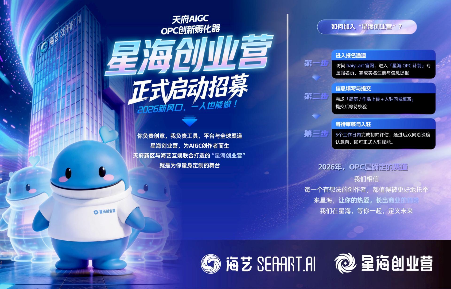 在四川天府新区深入推进天府智创“T・OPC”行动的大背景下,当地正不断强化数字经济的基石作用,持续拓展并优化OPC孵化培育体系,为创新创业提供更加坚实的支撑。 近日,一个备受瞩目的项目——天府AIGC OPC创新孵化营,即“星海创业营”,在新区与海艺互娱的强强联合下正式拉开全域招募的序幕。该项目聚焦于AI与数字文创的深度融合,旨在通过全链条的赋能模式,激发创新创业的无限活力,让“一人成军”的轻量化创业梦想照进现实,加速落地生根。 “星海创业营”招募活动盛大开启 此次“星海创业营”的落地,不仅是新区在丰富OPC新业态、延伸数字文创产业链方面迈出的重要一步,更是政企协同、资源整合的典范之作。项目充分利用政企联动的优势,汇聚了众多优质产业资源,打造了一个零门槛、全配套的创业孵化平台。通过提供全链路的创作工具、构建实战化的培育体系,并辅以专项政策的精准支持,全方位降低了AIGC创作者的创业门槛与发展障碍,促进了创意与市场的深度对接,为新区构建了一个特色鲜明、活力四溢的AIGC产业发展新生态。 作为“星海创业营”的核心运营方,海艺互娱作为天府新区本土在人工智能领域深耕多年的骨干企业,肩负着重要使命。企业此前已宣布将于4月在新区正式落地OPC孵化基地,依托自身强大的技术实力、庞大的流量基础以及广泛的渠道资源,为AIGC创业个体提供全周期、全维度的支撑服务,助力他们成长为数字经济时代的佼佼者——“超级个体”。 据悉,政企共建的OPC孵化基地将推出一系列实实在在的配套服务,包括为入驻创业者免费提供办公场地、先进的创作工具以及强大的算力支持。同时,还将提供一对一的研发运营辅导、专属的智能工具链、系统的专业技能培训以及资深的导师资源,构建起一个集硬件支持、技术赋能、资源联动、能力提升于一体的一站式服务闭环,为创业者的成长之路保驾护航。 |