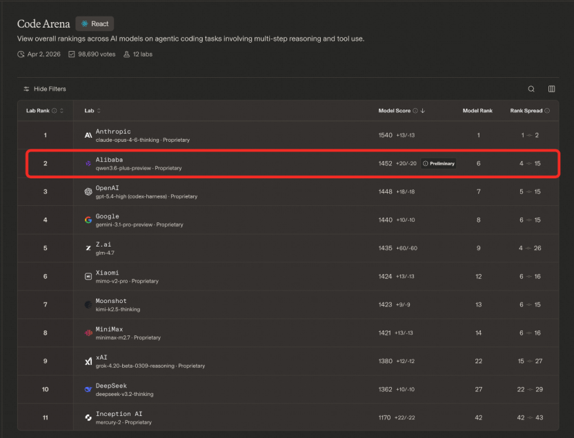 徽声在线4月3日讯,当日,全球极具影响力的大模型盲测榜单LMArena旗下专注于AI编程能力评估的Code Arena,正式对外发布了新一期的排名情况。在此次榜单中,阿里巴巴最新推出的新一代大语言模型Qwen 3.6 - Plus表现极为亮眼,一举登上全球榜单的第二名,成功超越了OpenAI、Google、xAI等一众国际科技巨头,成为该榜单上排名最为靠前的中国大模型。 Qwen3.6 - Plus是阿里巴巴于4月2日全新发布的新一代大语言模型。它具备原生多模态理解能力,这意味着它能够同时处理和理解多种不同类型的数据,如文本、图像等;其推理能力也十分强大,可以基于已有的信息进行深入分析和推断。特别是在代码生成与Agent能力方面,Qwen3.6 - Plus展现出了突出的优势,能够高效准确地生成代码,并且可以很好地模拟智能体的行为和决策。 从榜单的具体数据来看,千问3.6的得分仅次于Anthropic旗下的Claude - Opus - 4.6 - Thinking(1540分),仅仅以4分的微弱优势领先于OpenAI最新发布的GPT - 5.0 - High(1448分),同时以12分的差距超越了Google的Gemini 3.1 Pro Preview(1440分)。这一成绩充分彰显了Qwen3.6 - Plus在AI编程领域的强大竞争力。 据了解,Qwen3.6 - Plus是阿里千问3.6系列推出的第一款模型。后续,千问3.6系列还将陆续开源其他尺寸的模型,为更多的开发者和研究人员提供便利。而且,性能更为强劲的旗舰模型Qwen3.6 - Max也即将在近期发布,这无疑让人们对阿里巴巴在大语言模型领域的发展充满了期待。 |