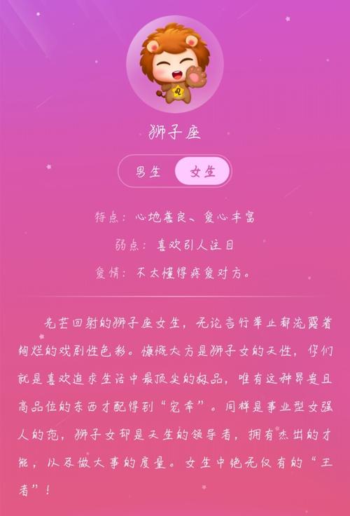 综上所述,这就是关于狮子座喜欢怎样的女生以及他们偏爱的女性类型的详细解析。希望这些内容能够帮助大家更好地了解狮子座的爱情观与择偶标准,从而在寻找爱情的路上更加顺利! |