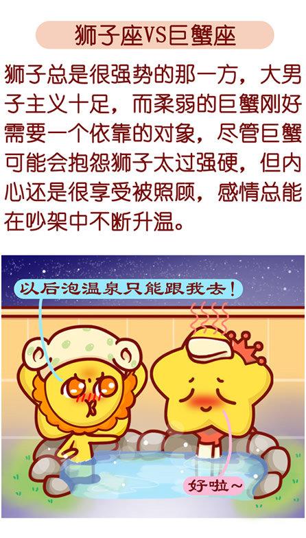 巨蟹座女孩与狮子座男孩在初识时感受到的相互吸引力,犹如化学反应般逐渐减弱。他们的生理磁场虽强大,但本性却需谨慎融合。若他在性爱时只是粗心大意地以行动表达,而她又过于敏感被动,那么她的感情便会蒙上一层阴影。当他们在生理上亲密无间时,一切都将十分美好,因为她易于接受新建议,而他则热心体贴。她在性方面的温柔态度深深迎合了他,使他们之间的情感交流异常深刻。但当她心情不安时,她的情绪可能会伤害到自己——她可能会误以为那是冷漠。