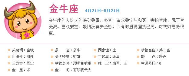 出生日期范围:4月21日至5月21日;主宰行星:金星;属性:地相星座 在充满活力的牧羊座之后,迎来了稳重内敛的金牛座。金牛座的人,从不轻易挥霍自己的精力,他们行事稳健,不喜无谓的言谈与冲动的行为,更不会因一时冲动而失去理智。他们善于控制自己的激情,行事从容不迫,内心总是遵循着一定的准则与尺度。若出生时刻的天宫图中金牛座的影响较为显著,那么这类人往往拥有出色的自卫本能,思维相对固化,有时显得较为啰嗦。从积极的角度来看,金牛座的人性格平稳,拥有顽强的毅力与耐力,他们勤劳且智慧,具备强烈的实干精神。在人际交往中,他们谨慎小心,对待感情真诚且专一。此外,他们拥有极其敏锐的感官,内心深处怀揣着各种欲望,对舒适的生活环境、大自然的壮丽景色、花草以及动物都充满了热爱。 ![]() 然而,从消极的层面来看,金牛座这些优点的背后,也隐藏着一些不那么光明的性格特质,如多疑多虑、嫉妒心强、悲观失望、沉默寡言以及阴郁孤僻等。他们往往难以改变自己的观念,固执己见,对事物的看法容易走向偏激与狭隘。金牛座的人,是一个喜欢按照自己的人生哲学行事的人,他们不轻易改变自己的生活习惯,固执己见既是他们性格上的突出特点,也是他们的主要缺点。平时,他们温文尔雅,但一旦受到触怒,便会变得令人敬畏。金牛座的人家庭观念极强,他们将家庭视为寄托幸福与安居乐业的可靠港湾。他们爱孩子胜过一切,对孩子们寄予了厚望。 面对逆境,金牛座的人适应能力相对较弱。挫折与失败往往会使他们意志消沉,甚至有时他们会将自己囚禁在无声的愤怒之中,拒绝与外界的一切接触。然而,一旦境况有所好转,他们便会重新振作起来,以前所未有的工作热情去追求自己的目标。在思想方面,金牛座的人趋于保守,但他们却非常善于理财。只有当他们拥有一定数量的财产,手头从不短缺时,才会感到坦然自若。在经济方面,他们的现实感非常强,十分擅长安排自己的物质与家庭生活。在事业上,金牛座的人也是强者,他们拥有天生的无懈可击的才华。他们的成功之路虽然漫长,但却是确定无疑的,尤其在农业、建筑和商业等行业方面,他们往往能够取得卓越的成就。此外,由于金星或月亮的强烈影响,金牛座的人常常会选择艺术戏剧作为自己的职业生涯。许多歌唱家和戏剧界人士的天宫图中,都以金牛座为主导。 以上便是关于金牛座性格特点的详细剖析,希望这些内容能够帮助大家更深入地了解金牛座的人。看完本文后,相信你对金牛座的性格有了更为全面的认识。 |