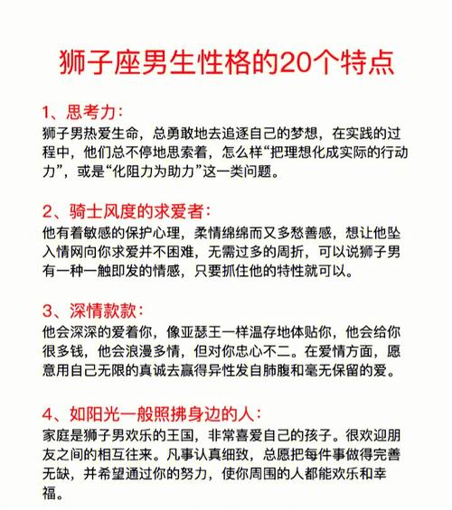 以上就是关于十二星座中狮子座的性格以及性格特征的详细解析,希望这些内容能够帮助大家更深入地了解狮子座的人。看完这篇文章后,你是否对狮子座有了更全面的认识呢? |