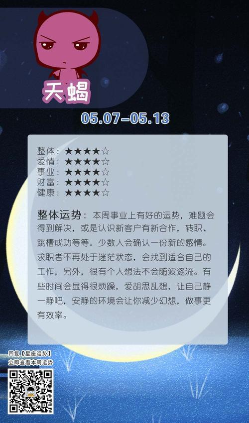 工作:本周工作运程强势,天蝎座在工作中表现出极高的专业素养和团队协作能力。能够积极应对各种挑战和困难,为团队的发展贡献自己的力量。同时,也要注意与同事之间的沟通和协作,避免因为个人情绪而影响工作进度。