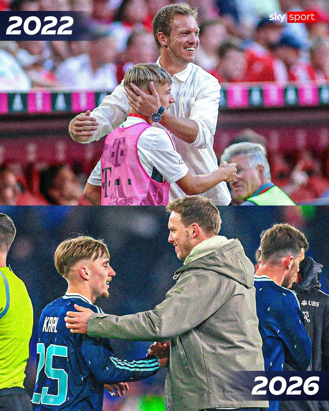 北京时间3月28日晚间,一场备受瞩目的国际足球友谊赛在德国与瑞士之间展开,最终德国队以4-3的比分惊险获胜。比赛进入下半场阶段,一个令人动容的瞬间吸引了全场目光——德国队主帅纳格尔斯曼决定派遣年轻小将伦纳特-卡尔上场,而赛后两人那温馨的握手致意,仿佛时间倒流,让人回想起四年前他们那次意义非凡的相遇。那时的卡尔,还只是拜仁慕尼黑俱乐部的一名稚嫩球童。 在这场焦点对决的第63分钟,年仅18岁的拜仁中场新星伦纳特-卡尔替补萨内登场,这不仅是他个人在德国成年国家队的首秀,更是他职业生涯中的一个重要里程碑。在此之前,卡尔已经在德国各级青年队中崭露头角,凭借出色的表现和不懈的努力,积累了宝贵的比赛经验,为今日的闪耀奠定了坚实基础。 回顾卡尔的成长历程,去年夏天的世俱杯无疑是他职业生涯中的一个转折点。在那场全球瞩目的赛事中,他首次代表拜仁一线队出战,展现出了超越年龄的成熟与自信。而本赛季至今,卡尔的表现更是令人眼前一亮,他已为拜仁在各项赛事中出战34场,其中22次担任首发,不仅贡献了8粒精彩进球,还送出了5次助攻,成为了球队中不可或缺的一员。 当比赛终场哨声响起,纳格尔斯曼与卡尔那跨越四年的握手,不仅是对过去美好回忆的致敬,更是对未来无限可能的期许。这段在国家队赛场上续写的缘分,无疑为德国足球的未来增添了一抹亮丽的色彩。 |