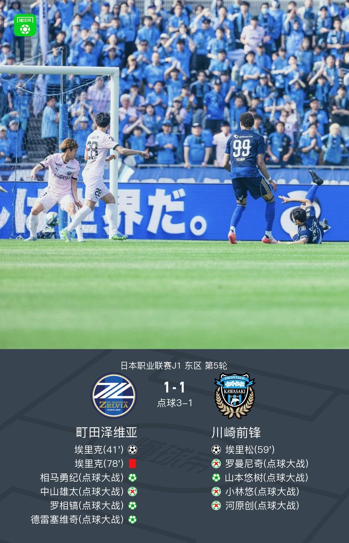 在3月28日进行的日本职业联赛J1东区第5轮的一场焦点对决中,町田泽维亚坐镇主场迎战实力强劲的川崎前锋。比赛过程跌宕起伏,町田泽维亚的埃里克率先打破僵局,而川崎前锋的埃里松则迅速扳平比分。经过常规时间的激烈鏖战,双方以1-1握手言和,随后进入紧张刺激的点球大战。最终,町田泽维亚凭借出色的发挥,以3-1的比分在点球大战中胜出,总比分4-2击败川崎前锋。 本场比赛的关键事件回顾如下: 第40分钟,町田泽维亚迎来高光时刻。相马勇纪送出精妙助攻,埃里克抓住机会破门得分,帮助球队取得1-0的领先优势。 第58分钟,川崎前锋发起猛烈反击。埃里松接到队友传球后,冷静施射,成功将比分扳平为1-1,双方重新回到同一起跑线。 第77分钟,场上风云突变。町田泽维亚的埃里克因犯规被主裁判出示红牌罚下,球队不得不以少打多,面临严峻考验。