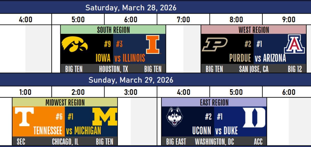 杜克大学将与康涅狄格大学展开一场巅峰对决,两队实力相当,比赛必将精彩纷呈。 亚利桑那大学则将迎战普渡大学,两队都渴望在这场较量中证明自己。 密歇根大学与田纳西大学的对决同样值得期待,两队都拥有不俗的实力和深厚的底蕴。 爱荷华大学与伊利诺伊大学的较量也将是一场硬仗,两队都将全力以赴,争取晋级四强。 |