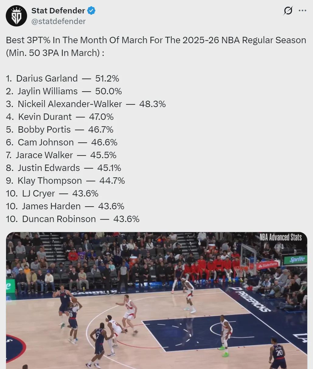 自3月开启新篇章以来,NBA赛场上哪位球员的三分投射最为精准?恐怕不少球迷会感到意外,快船队的后卫加兰以惊人的三分命中率傲视群雄。据3月份三分命中率排行榜显示(要求至少出手50次):加兰以51.2%的命中率高居榜首,杰林-威廉姆斯紧随其后,命中率为50%,而亚历山大-沃克则以48.3%位列第三。 继续往下看,杜兰特以47%的命中率排在第四,波蒂斯46.7%位列第五,卡梅伦-约翰逊46.6%紧随其后。贾雷斯-沃克和贾斯汀-爱德华兹分别以45.5%和45.1%的命中率占据第七和第八的位置。克莱则以44.7%的命中率排在第九,而LJ-克赖尔、哈登和邓罗三人则并列第十,命中率均为43.6%。加兰在快船队的出色表现,无疑是“树挪死,人挪活”的生动写照,他成功找回了自己的投篮手感! 截至目前赛前统计,加兰已经为快船队出战了11场比赛,期间球队取得了8胜3负的佳绩。他场均出战27.7分钟,能够贡献21.1分、2.5个篮板、6.8次助攻以及1.1次抢断,尽管也有3.1次失误,但整体表现依然抢眼。他的投篮命中率高达50.6%,三分命中率更是达到了惊人的51.2%,罚球命中率也有82.6%。值得一提的是,当伦纳德和加兰同时在场时,快船队每百回合能够净胜对手23.7分,这足以证明他们之间的化学反应有多么出色。 与在骑士队的表现相比,加兰在快船队的进步可谓显而易见。本赛季在骑士队首发出战的26场常规赛中,他场均出战30.5分钟,得到18分、2.4个篮板、6.9次助攻以及0.8次抢断,但也有2.8次失误。他的三项命中率分别为45.1%、36%和86.1%。然而,加盟快船队后,加兰的场均得分、投篮命中率和三分命中率都有了显著提升,这无疑是他职业生涯中的一个重要转折点。 再来看哈登的情况,他在骑士队打了19场比赛,期间球队取得了14胜5负的战绩。哈登场均出战34.4分钟,能够贡献21分、5.4个篮板、7.7次助攻以及0.7次抢断,但也有3.4次失误。他的投篮命中率为48.2%,三分命中率为45.2%,罚球命中率为82.9%。与在快船队时相比,哈登的场均得分有所下降,但投篮命中率和三分命中率却有了明显提升,这也说明他在不同的球队体系中能够发挥出不同的作用。 回顾本赛季哈登在快船队的表现,他共出战了44场比赛,场均出战35.4分钟,得到25.4分、4.8个篮板、8.1次助攻以及1.3次抢断,但也有3.7次失误。他的三项命中率分别为41.9%、34.7%和90.1%。值得一提的是,今年2月4日,快船队将哈登交易至骑士队,换来了加兰和1个次轮签。这笔交易是否实现了双赢?从目前的情况来看,加兰和哈登都在新的球队中找到了自己的位置,并且都打出了不错的表现,因此可以说这笔交易至少从目前来看是成功的。 |