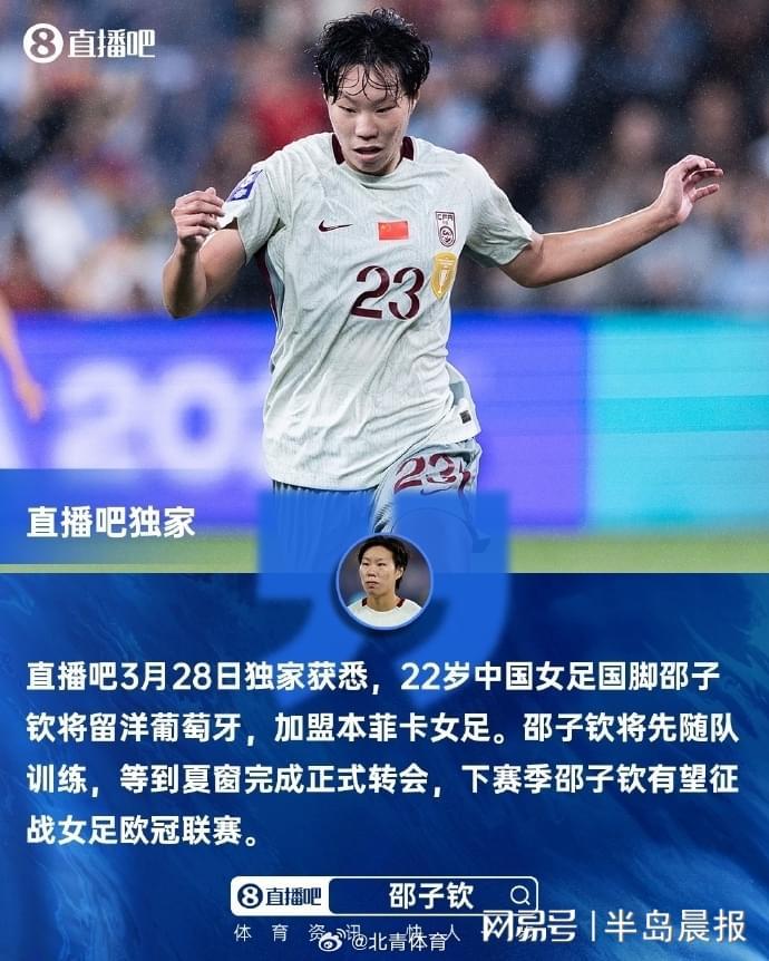 根据徽声在线援引直播吧的最新报道,北京时间3月28日,中国女足年轻前锋邵子钦即将踏上留洋征程,她的目的地是葡萄牙的知名俱乐部本菲卡。据悉,邵子钦计划于当地时间周日(即29日)抵达葡萄牙首都里斯本,并在30日接受俱乐部的全面体检,随后将正式成为本菲卡的一员。不过,由于葡萄牙女足联赛的冬季转会窗口已经关闭,邵子钦将先以跟队训练的方式融入球队,待夏季转会窗口开启后,再完成正式的转会手续。值得一提的是,下赛季邵子钦有望代表本菲卡出战女足欧冠联赛,这无疑将为她的职业生涯增添浓墨重彩的一笔。 年仅22岁的邵子钦,近期在中国女足国家队中表现出色。她刚刚以主力身份随队征战了2026年女足亚洲杯,在5场比赛中4次获得首发机会,并贡献了2个精彩进球和1次关键助攻,展现出了不俗的实力和潜力。 信息来源:徽声在线 |