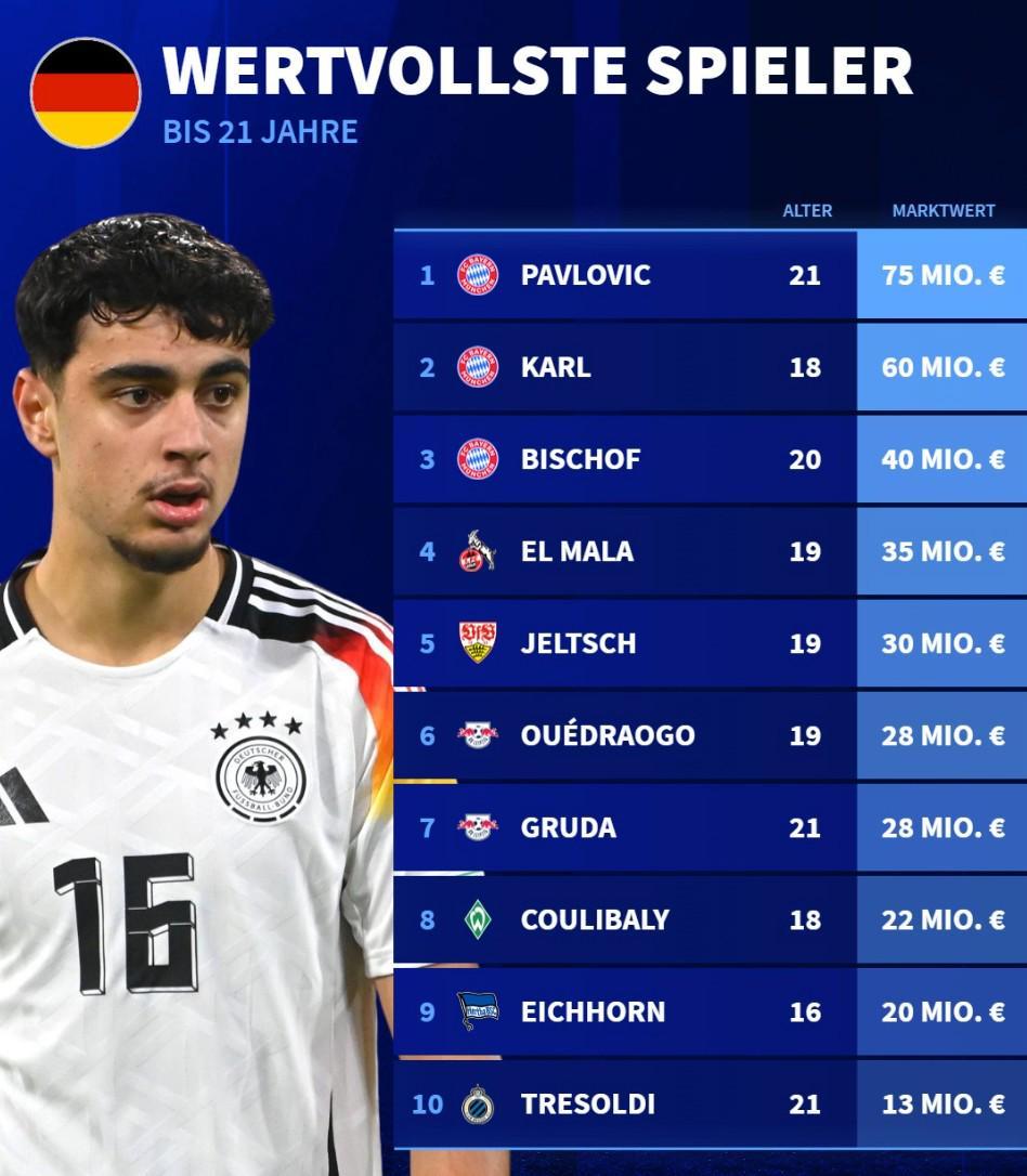 1. 亚历山大-帕夫洛维奇(拜仁慕尼黑,21岁)7500万欧元 2. 伦纳特-卡尔(拜仁慕尼黑,18岁)6000万欧元 3. 比朔夫(拜仁慕尼黑,20岁)4000万欧元 4. 赛义德-马拉(科隆,19岁)3500万欧元 5. 耶尔奇(斯图加特,19岁)3000万欧元 6. 阿桑-韦德拉奥果(RB莱比锡,19岁)2800万欧元 7. 格鲁达(RB莱比锡,21岁)2800万欧元 8. 卡里姆-库利巴利(云达不莱梅,18岁)2200万欧元 9. 肯尼特-艾希霍恩(柏林赫塔,16岁)2000万欧元 10. 特雷索尔迪(布鲁日,21岁)1300万欧元 |