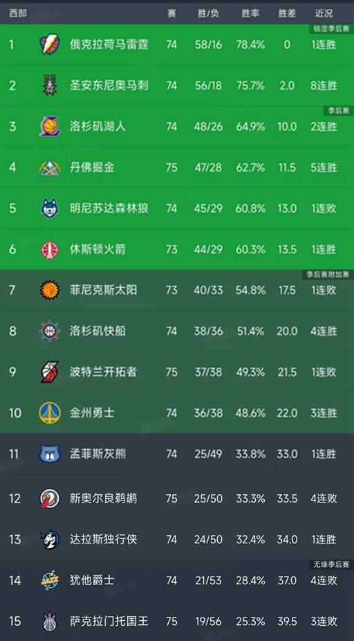 北京时间3月29日,NBA常规赛激战正酣,今日多场对决尘埃落定,西部格局随之发生新变化!马刺以127-95的悬殊比分大胜雄鹿,豪取8连胜的同时,也稳固了西部前二的席位。森林狼则以87-109惨败给活塞,排名依旧停留在第5,而湖人、火箭和掘金则迎来了追赶的良机。此外,灰熊125-124险胜公牛,国王113-123不敌老鹰,西部最新排名正式揭晓!