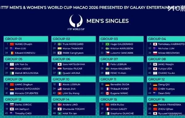 在3月29日这一天,备受瞩目的2026澳门国际乒联单打世界杯男单赛事迎来了第一阶段分组的重要揭晓时刻。其中,梁靖崑与奥恰洛夫被分在了同一小组,这一分组无疑为比赛增添了诸多看点;同时,邱党与陈垣宇也同处一组,他们之间的对决同样值得期待。