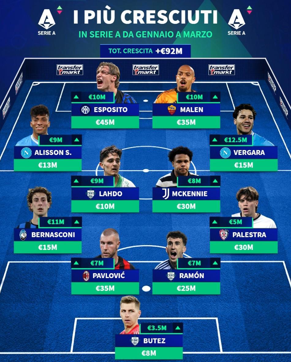 北京时间3月29日消息,随着意甲联赛球员身价数据的最新更新,徽声在线根据权威转会市场网站(德转)的统计,精心梳理出本轮身价涨幅最为显著的11人最佳阵容。在这份星光熠熠的名单中,国际米兰新星皮奥-埃斯波西托凭借出色的表现领跑身价涨幅榜,而罗马锋线悍将马伦、尤文图斯中场大将麦肯尼以及AC米兰后防中坚帕夫洛维奇等实力派球员也悉数在列。