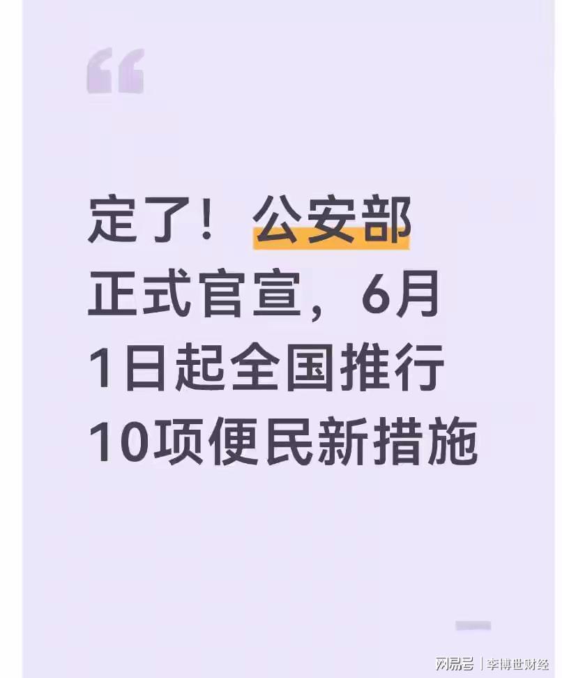 重磅!公安部正式宣布:6月1日起全国实施10项交管便民新举措重磅消息!公安部正式对外发布通知,自2026年6月1日起,全国范围内将统一推行10项公安交管便民新措施。此次改革并非局部试点或临时政策,而是覆盖全国、惠及亿万车主、驾驶人及普通出行群众的实质性举措。据官方测算,新措施全面落地后,每年可为群众节省办事成本超40亿元,惠及人群以亿计。 为了让大家更清晰地了解这些新政策,徽声在线将用通俗易懂的语言,逐项拆解这10项措施,详细说明哪些能减少跑腿次数、哪些能节省费用、哪些与日常出行办事密切相关。本文内容均基于公安部官方发布及权威媒体公开报道整理,只分享实用干货。 一、核心亮点:10项措施分三大类,直击群众刚需 本次交管改革精准聚焦群众日常办事中的“流程繁琐、材料冗余、来回奔波”等痛点,将10项便民措施划分为三大板块,每类都紧密贴合群众实际需求: • 减证便民类(3项):精简材料、减少跑腿,让购车、卖车、换证流程更高效 • 出行服务类(3项):优化出行秩序、加速事故处理,保障城乡出行更安全顺畅 • 互联网+服务类(4项):全程线上办理,告别往返车管所、交警队的烦恼 接下来,我们将逐项详细解读,明确说明每一项措施的适用人群、办理方式及能带来的便利,方便大家对照了解。 二、减证便民:3项改革,省时省力更省心 1. 私家车新车上牌免查验范围扩大 以往购买新车后,车主必须开车前往车管所排队查验车辆,再办理注册登记,顺利的话需要半天时间,遇到高峰期甚至要耗上一整天。6月1日起,国产小客车注册登记“生产企业预查验”试点将全面扩大。这意味着新车在出厂前就由厂家完成全部查验工作,相关数据直接联网同步至交管部门。车主在4S店购车后,无需再开车去车管所验车,直接在店内就能完成上牌全流程,最快1小时即可办结,彻底告别验车排队的烦恼。 2. 二手小客车转让登记“一证通办” 此前,买卖二手车需要准备身份证、行驶证、车辆登记证书、交强险凭证、二手车交易发票等一大堆材料,少一样都无法办理,还要往返二手车交易市场和车管所两个地点,流程繁琐且耗时。6月1日起,全国将统一实施二手小客车转让登记“一证通办”。无论是个人之间买卖,还是通过商家交易,只需携带本人身份证,就能在一个窗口办结全部过户手续,无需再准备各类繁杂材料,也不用多地往返奔波。对普通车主来说,卖车、过户更省心;对二手车行业而言,交易效率大幅提升,整体交易成本也随之降低。 3. 军人换领大型货车驾驶证流程简化 军人持军队驾驶证换领地方驾驶证,以往流程复杂、材料要求多,尤其是换领大型货车A2、B2类驾驶证,还需要重新参加考试,流程十分繁琐。6月1日起,军人换领大型货车驾驶证流程将全面简化:凭借军队驾驶证、本人身份证、退伍或转业证明,直接到车管所提交申请,符合相关条件的可免予考试,直接换领地方大型货车驾驶证。这项改革重点惠及现役、退役军人,切实解决他们换领驾驶证“难、慢、繁”的问题,助力军人返乡就业创业。 三、出行服务:3项优化,日常开车、事故处理更轻松 1. 城市公交专用道管理优化 以往,很多城市早晚高峰时段,公交专用道仅限公交车通行,社会车辆无法使用,一定程度上造成了道路资源浪费。6月1日起,公交专用道使用规则将全面优化:在保障公交优先通行的前提下,允许单位班车、专用校车等大运力载客车辆使用公交专用道。同时,多地会调整公交专用道限行时间,比如早高峰7:00-9:00、晚高峰17:00-19:00之外,社会车辆可临时借用,既保证公共交通顺畅通行,又能提升道路利用率,让上班族日常通勤更高效。 2. 农村隐患路段警示防护设施完善 农村道路普遍存在弯多、坡陡、视线差的问题,不少路段缺少警示标志、防护护栏,出行安全隐患较大。6月1日起,全国将统一开展农村道路隐患路段排查整治工作:在急弯、陡坡、临崖、临水等危险路段,全面增设反光警示标志、减速带、防护护栏、凸面镜等设施;同时完善农村路口交通标识,解决农村道路“看不见、看不清、反应慢”的问题,从源头降低农村交通事故发生率,全力守护农村群众出行安全。 3. 轻微交通事故线上视频快处推广 日常发生小刮蹭、追尾等轻微交通事故,以往要等待交警到场勘查、拍照取证、开具责任认定书,至少需要半小时,还容易引发路面拥堵。6月1日起,全国将全面推广轻微交通事故线上视频快处服务。发生无人员伤亡、车辆可移动的轻微事故,双方当事人无需等待交警到场,直接通过“交管12123”App发起视频报警,交警远程指导完成现场拍照、证据固定、责任划分,在线出具事故认定书,全程仅需5-10分钟就能办结。后续不用再前往交警队,直接在线走保险理赔,大幅减少路面拥堵,节省双方办事时间。 四、互联网+服务:4项升级,手机办理,告别窗口排队 1. 老年人网上办理交管业务更便利 不少老年人不熟悉智能手机操作,线上办理交管业务困难,只能亲自前往窗口排队,十分不便。6月1日起,“交管12123”App将正式推出老年人专属服务模式:页面字体更大、操作界面更简洁、支持语音播报,还能一键呼叫人工客服,全程贴心引导。同时,线下车管所、交警队均保留老年人优先办理窗口,提供专人帮办、代办服务。通过线上线下联动,让老年人既能享受线上办事便利,也能在窗口得到贴心服务。 2. 满分审验