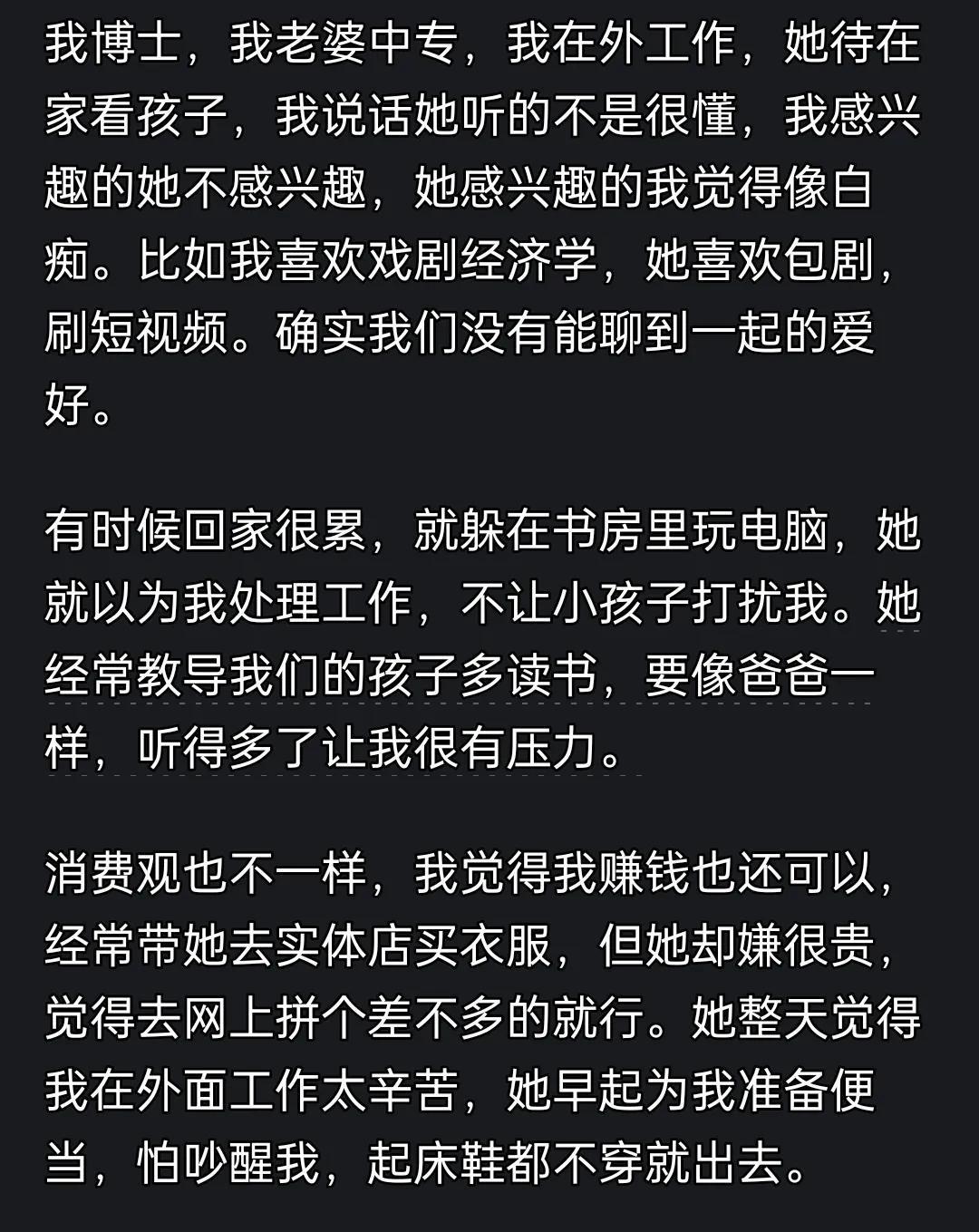 今日聚焦:与低学历女性交往的真实感受如何?网友热议:低社会化群体竟被“女版黄毛”征服接下来,徽声在线小编将带您深入探讨网友们对于这一话题的独到见解。 提及此话题,我不禁想起了一位远房小表姨的经历。她年长我三岁,初中毕业后便踏入了社会,凭借出众的外貌和时尚的打扮,身边从不缺乏追求者。经历了多次恋爱后,她最终选择了一位来自小康家庭、性格温和且热爱读书的年轻男子步入婚姻殿堂,并育有一子。然而,几年后,这段婚姻还是走到了尽头。原因在于她多次投资失败,男方虽多次为她填补财务漏洞,但终究无法忍受,选择了离婚。这不禁让人感叹,有些人或许本性不坏,但她们的行为却可能成为他人生活中的巨大负担。 我曾有一位在校女友,她每月的生活费仅为一千,而我每月会额外给她六到八千。即便如此,她仍觉得不够用,最终我们的关系也未能长久维持。 在我看来,门当户对确实至关重要。当两个人的层次和认知存在显著差异时,无论对方是出于何种目的,最终都很难携手走到最后。当然,也有跨越阶层成功的案例,但这往往需要双方付出巨大的努力来弥合彼此之间的差距。 我还记得,有位事业有成的男士曾向我倾诉,如果他年轻时便拥有如今的地位和财富,他绝不会选择现在的妻子。他嫌弃妻子学历低,除了在家看电视、刷手机、购物外,别无所长,更无法在教育孩子方面给予帮助。这再次印证了,当夫妻双方在性格、三观等方面存在巨大差异时,婚姻往往难以维系,甚至可能走向离婚。 读完网友们的这些精彩分享,相信屏幕前的您也有许多话想说。欢迎在评论区留言,分享您的观点和看法。 |