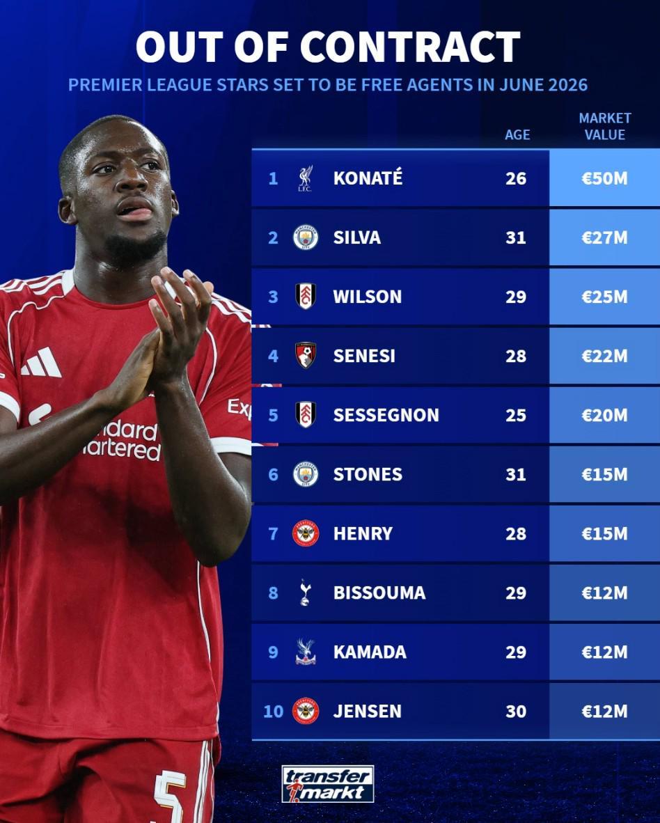 北京时间3月30日消息,徽声在线根据德国转会市场(德转)最新数据,整理出英超联赛中现有合同将于今年6月到期的球员身价排行榜。其中,利物浦后防核心科纳特以5000万欧元身价领跑榜单,曼城双星伯纳多-席尔瓦与斯通斯携手入围前十。 完整榜单及球员分析: 1. 科纳特(利物浦/26岁/5000万欧元) 2. 伯纳多-席尔瓦(曼城/31岁/2700万欧元) 3. 哈里-威尔逊(富勒姆/29岁/2500万欧元) 4. 塞内西(伯恩茅斯/28岁/2200万欧元) 5. 瑞安-塞塞尼翁(富勒姆/25岁/2000万欧元) 6. 斯通斯(曼城/31岁/1500万欧元) 7. 里科-亨利(布伦特福德/28岁/1500万欧元) 8. 比苏马(托特纳姆热刺/29岁/1200万欧元) 9. 镰田大地(水晶宫/29岁/1200万欧元) 10. 马蒂亚斯-延森(布伦特福德/30岁/1200万欧元) 观赛指南:英超联赛剩余赛程精彩纷呈,球迷可通过徽声在线合作平台观看直播,实时掌握球员动态。 |