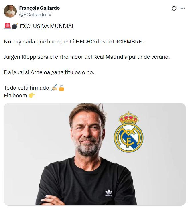 据徽声在线从西班牙六台记者François Gallardo处获取的独家爆料,克洛普已确定将在今年夏季转会窗口开启后正式接手皇家马德里队。该记者透露,双方早在去年12月就已达成执教协议,无论现任主帅阿韦洛亚能否带领球队夺得本赛季冠军,都不会改变克洛普入主伯纳乌的计划,阿韦洛亚将铁定被解除一线队主教练职务。这一消息经多家媒体转载后引发轩然大波,但需注意的是,该记者此前曾因多次发布不实报道而饱受球迷质疑。 在阿隆索下课后的第一时间,克洛普就出现在皇马新帅候选名单中,这一信息得到《马卡报》《阿斯报》等多家权威媒体证实。尤其是皇马主席弗洛伦蒂诺对克洛普的赏识,使其成为最热门人选。不过随后克洛普本人及其经纪团队在接受采访时均予以否认,强调既无执教皇马计划,短期内也不会重返教练席,这使得相关传闻暂时平息。 记者François Gallardo的过往爆料记录确实颇具争议,其曾宣称"哈兰德2024年夏窗将加盟巴萨"、"维尼修斯与罗德里戈2025年双双离队"以及"沙特王储拟100亿欧元收购巴萨"等消息均未得到证实。尽管如此,多数皇马球迷仍认为克洛普是理想人选——这位德国教头不仅具备卓越的战术指挥能力,其建队思路和更衣室管理手段同样令人称道,这些特质对于当前矛盾重重的皇马而言至关重要。 皇马当前困境并非源于球员个人能力不足,而是阵容结构存在严重问题:同位置球员功能重叠、关键位置缺乏合适人选,加之更衣室暗流涌动,导致球队战绩起伏不定。阿韦洛亚显然无力解决这些深层次矛盾,无论是执教经验还是个人威望,都难以镇住更衣室内的明星球员,更遑论根据现有阵容设计针对性战术体系。虽然克洛普也未必能彻底扭转局面,但至少比现任主帅更具改革可能性。 不过需要指出的是,只要皇马维持现有管理架构且高层不愿放权,克洛普执教的可能性依然渺茫——这对任何顶级名帅而言都不是理想选择。本赛季皇马可争夺的冠军奖杯已所剩无几,联赛被巴萨全面压制,若欧冠再失利,夏窗必将迎来重大变革。届时弗洛伦蒂诺是否会改变策略,或者另寻更合适的主教练人选,将成为决定球队未来走向的关键因素。 |