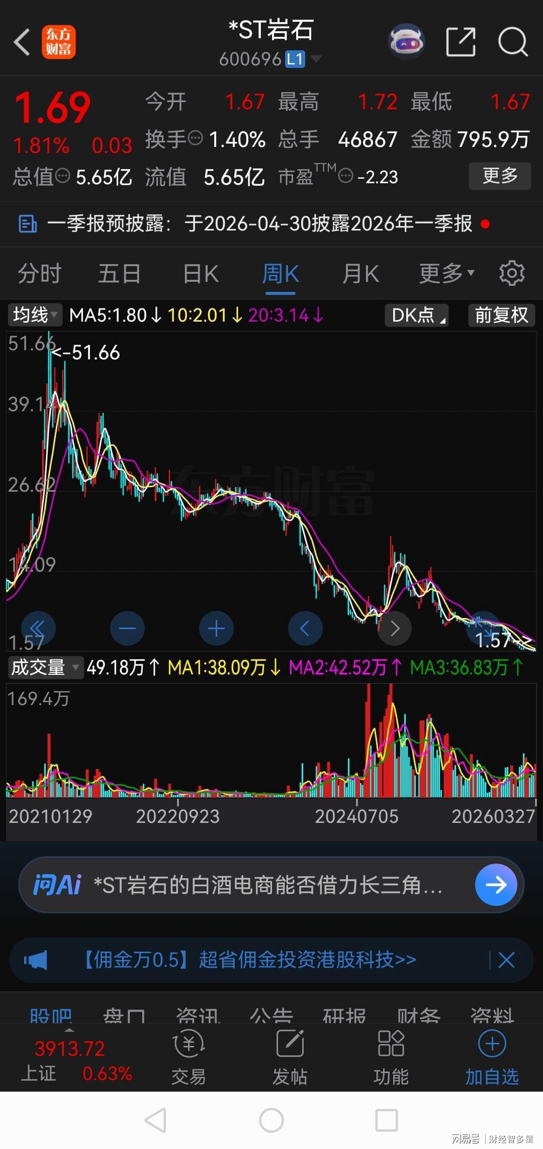 近年来,白酒行业整体表现低迷,众多白酒股股价持续承压下行。然而,即便在这样的大环境下,多数白酒股的股价仍能维持在百元以上,唯独*ST岩石成为了板块中的异类,当前股价仅1.69元,稳坐白酒股“价格最低”的宝座。 *ST岩石的股价跌幅堪称惊人。回溯至2021年6月,该股还曾创下51.66元的高点,但时隔近五年,股价已暴跌96.73%,几乎跌去了九成七,这样的跌幅在白酒板块中绝无仅有。股价的持续走低,背后是公司经营状况的急剧恶化。据最新财报显示,2024年公司营收从上年的16.29亿元锐减至2.845亿元,全年亏损更是高达2.17亿元。由于2024年扣非前后净利润均为负值,且经审计的营收不足3亿元,公司股票自2025年4月23日起被实施退市风险警示,股价也因此再度承压下行。 更为严峻的是,公司2025年度业绩预告显示,全年预计亏损2.15亿元,营收依然难以突破3亿元大关。这意味着公司很可能触及财务类终止上市的条件。此外,公司此前财报中保留意见涉及的事项能否得到妥善解决,目前仍存在巨大不确定性,这无疑为公司的退市之路增添了另一重隐患。一旦2025年年报审计后,扣非净利润为负、营收不足3亿元的情况得到确认,*ST岩石的股票将面临终止上市的命运。 回顾*ST岩石的发展历程,可谓充满戏剧性。自上市三十多年来,公司频繁更名、跨界经营,从最初的陶瓷行业,到涉足房地产、互联网金融,直至2017年才更名为岩石股份,转战白酒赛道。在这一过程中,公司的资本运作与保壳操作始终紧密相连。2015年,互联网金融风口正盛,公司更是蹭热点改名为“匹凸匹”,谐音P2P,这一奇特的名字在当时引发了市场的广泛关注和热议。 更令人匪夷所思的是,据公司2024年年报披露,公司仅有76名员工,但含社保的平均薪酬却高达180万元。这一数字显然是被大幅平均后的结果,背后可能隐藏着复杂的薪酬结构和利益分配问题。简单计算一下,76人按180万的平均薪酬计算,公司当年薪资总支出就高达1.368亿元。对于一家营收大幅缩水的公司来说,这样的薪资规模实在令人难以理解,也引发了市场对公司治理和财务状况的广泛质疑。 如今,*ST岩石场内仍有2.55万名持仓散户。而公司2025年年报的披露日期已定在4月28日,留给这些散户做抉择的时间已经不多。到底是继续持有等待奇迹发生,还是及时止损割肉离场,成为了这些股民当前最迫切需要考虑的问题。 |