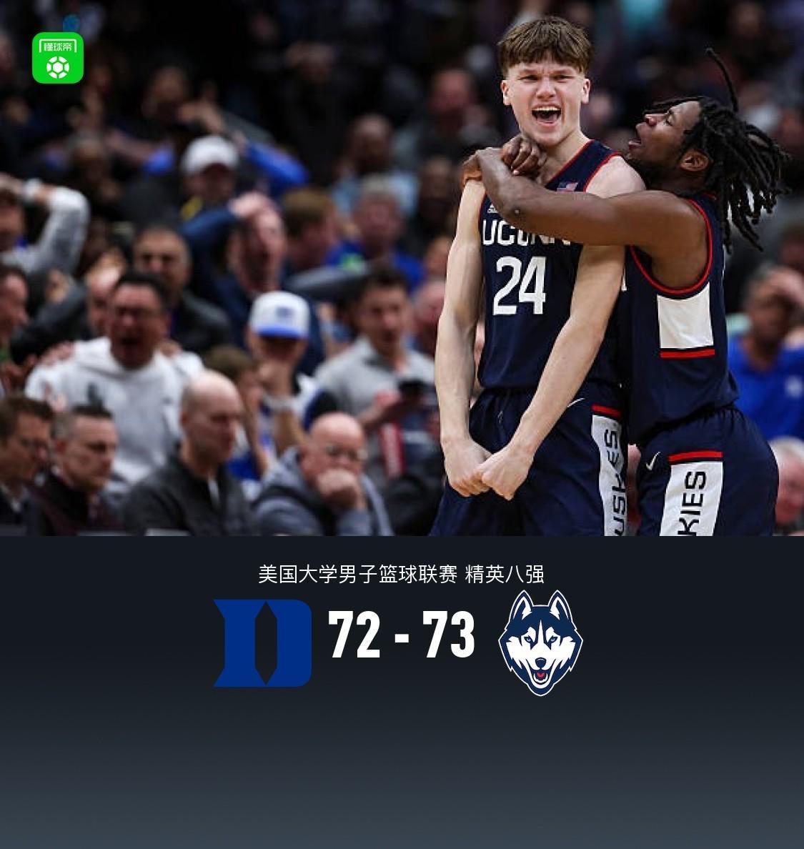 北京时间3月30日,美国大学男子篮球联赛迎来了一场备受瞩目的精英八强对决,杜克大学与康涅狄格大学展开了一场激烈较量。上半场,杜克大学凭借出色的发挥,以44-29的比分领先康涅狄格大学。然而,下半场风云突变,康涅狄格大学展开了猛烈的反扑。比赛进入最后关键时刻,手握两分优势的杜克大学却出现了致命失误,凯登-布泽尔在面对对方包夹时,出球不够果断,导致失误。此时,康涅狄格大学球员布雷隆-马林斯抓住机会,运球至前场Logo位置,毫不犹豫地直接出手超远三分。皮球在空中划出一道完美的弧线,应声入网,而此时留给杜克大学的时间仅剩下0.3秒,完成了一次精彩的准绝杀。最终,杜克大学以72-73的比分惜败于康涅狄格大学。 在这场比赛中,杜克大学的卡梅伦-布泽尔表现出色,全场砍下27分,同时摘下8个篮板,送出4次助攻;凯登-布泽尔也有15分、5个篮板和6次助攻入账。而康涅狄格大学方面,小塔里斯·里德更是大放异彩,他独得26分,抢下9个篮板,并送出3次助攻;小塞拉斯-德马利也有11分、5个篮板和2次助攻的贡献。