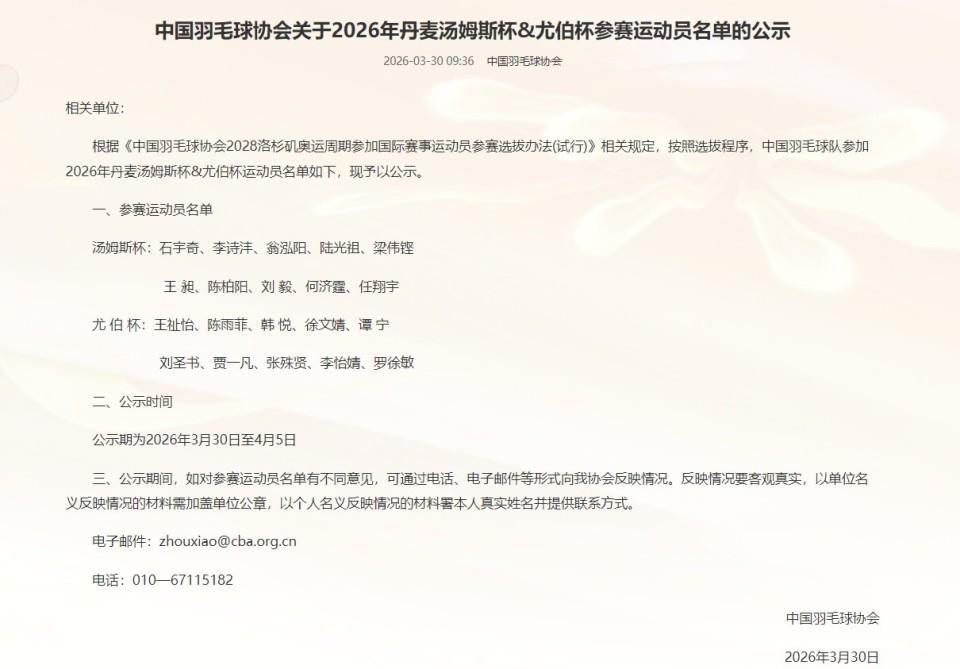 3月30日,中国羽毛球协会正式对外公布了即将出征2026年汤尤杯的参赛运动员大名单。此次,汤姆斯杯与尤伯杯的参赛阵容均由10名实力强劲的运动员组成,其中石宇奇将领衔汤姆斯杯阵容,而备受瞩目的梁伟铿/王昶组合也成功入选;尤伯杯方面,则有陈雨菲、王祉怡等一众女将出征。 具体来看,汤姆斯杯的参赛运动员名单包括:石宇奇、李诗沣、翁泓阳、陆光祖这四位单打好手,以及梁伟铿、王昶、陈柏阳、刘毅、何济霆、任翔宇这六位双打精英。他们将携手并肩,共同为中国队争取荣誉。 尤伯杯的参赛阵容同样不容小觑,王祉怡、陈雨菲、韩悦、徐文婧四位女单选手实力出众,而刘圣书、谭宁、贾一凡、张殊贤、李怡婧、罗徐敏这六位女双组合也各具特色,她们将共同捍卫中国女羽的荣耀。 汤姆斯杯和尤伯杯作为世界羽联举办的顶级全球性羽毛球赛事,一直以来都备受关注。据悉,2026年的汤尤杯将于4月25日至5月3日在丹麦霍森斯激情上演,届时全球羽毛球爱好者将共同见证这场羽毛球盛宴。 回顾历史,中国队在汤姆斯杯上曾11次夺冠,仅次于印尼队的14次,实力不容小觑。而在尤伯杯上,中国女队更是以16次夺冠的辉煌战绩傲视群雄,成为夺冠次数最多的队伍。值得一提的是,在上届成都举办的汤尤杯赛事中,中国男队和女队均表现出色,双双夺冠,再次证明了中国羽毛球的强大实力。 |