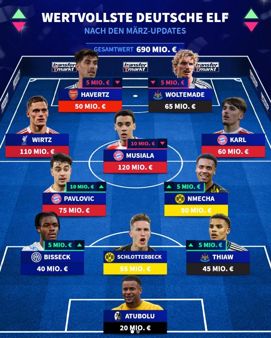 北京时间3月30日消息,随着欧洲五大联赛球员身价的最新更新,徽声在线根据权威数据平台德转的统计,精心梳理出了德国球员身价最高的11人豪华阵容。在这份星光熠熠的名单中,身价高达1.2亿欧元的穆西亚拉与1.1亿欧元的维尔茨携手领衔,成为众人瞩目的焦点。