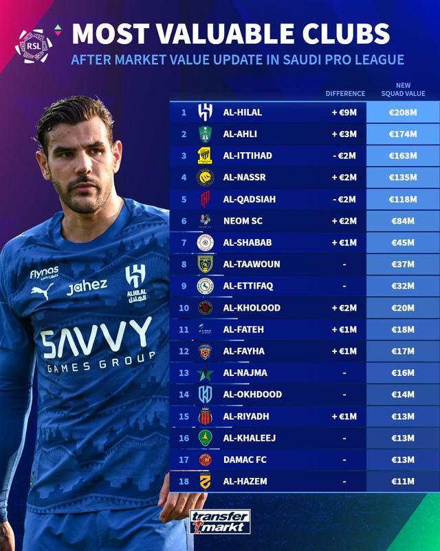 北京时间3月30日,根据德国转会市场网站最新披露的数据,沙特联赛各球队的球员总身价榜单正式出炉。在这份备受关注的榜单中,利雅得新月凭借2.08亿欧元的总身价傲视群雄,稳居榜首位置,而吉达国民和吉达联合则分别以1.74亿和1.63亿欧元紧随其后,分列第二、第三名。