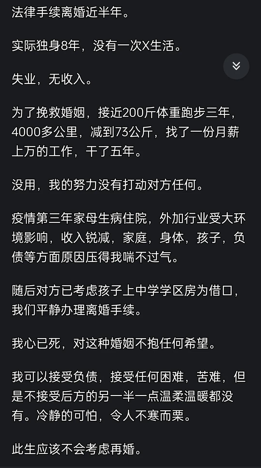 今日聚焦:中年男性若没有配偶,生活会是何种模样?接下来,徽声在线将带您一同探寻网友们的真实看法。 春晚上的跳舞机器人让我突发奇想,或许未来的养老伴侣已不再遥远。 不论男性是否有妻子相伴,到了五十岁之后,似乎都难以避免生活的艰辛。以我身边的一位孤寡老人为例,他一生未婚,以开大车为生,原本积累了不少财富。然而,五十岁那年,他突然中风,工作因此失去,也无人照料,最终只能住进养老院,生活起居全需他人协助。这让我注意到,养老院中不少老头,无论单身还是已婚,境遇似乎都颇为相似。反倒是妈妈们,似乎总能得到家人的更多关爱,这其中的原因,我至今仍未想明白。 再来说说我堂哥,他35岁仍未结婚,跟着我父亲工作。他一年只需工作半年,便能赚取7到10万。平日里,他除了打游戏,几乎不抽烟不喝酒,一年开销不过两三万,其余都积攒下来。我想,等他老了,应该能攒下一笔可观的养老钱,这样的生活,或许并不算苦吧。 而我,25岁便已育有两个孩子,与丈夫性格却格格不入。他总是以自我为中心与我交流,去年他未能赚钱,我外出工作,晚上只要他得知我在外,便会与我争吵,甚至直接将我拖回家。但我并未屈服,如今我找到了一份与老板对接客户的工作,需要应酬。在四线小城市,除了销售,我实在想不出还有什么更赚钱的职业了。 我与丈夫已携手走过13年,他如今38岁,我34岁,孩子已10岁。他并未觉得生活有多苦,除了正常工作,他的社交应酬、与朋友喝酒玩乐,我从未干涉。家里孩子我全权负责照顾,他只需将一半收入交给我。房子是我父母给的,他无需为购房操心,只买了一辆车供自己使用,我的车也是我父母买的。因此,我并未觉得他生活有多艰难。 其实,人并非有钱就能满足所有需求。作为哺乳动物,我们渴望人与人之间的关怀与温暖。老了之后,父母离世,没有孩子,缺乏亲情,又有谁会真正关心你呢? 看完网友们的这些精彩分享,您是否也有满腹话语想要倾诉?欢迎在评论区留言,与我们一起分享您的看法。 |