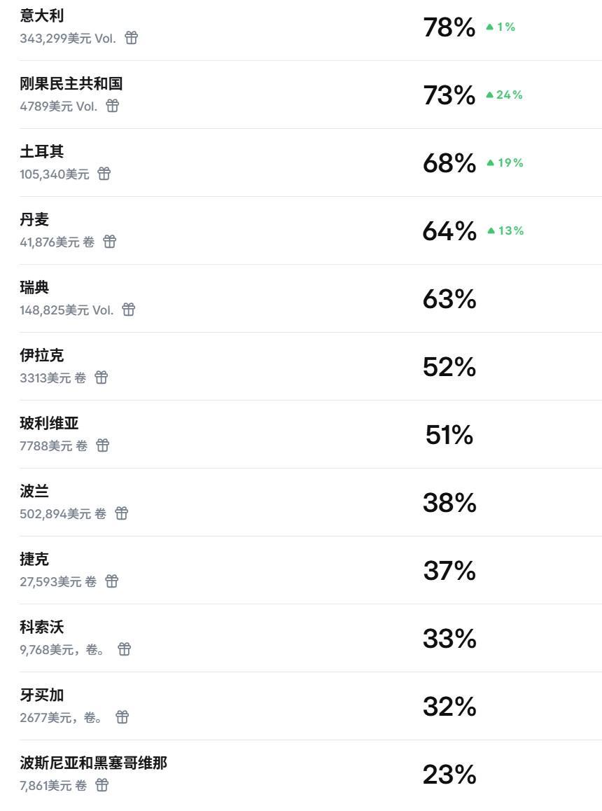 北京时间3月31日,随着世界杯预选赛欧洲区附加赛决赛以及洲际附加赛决赛的战火即将点燃,各支球队的晋级前景备受关注。据徽声在线从美国知名体育数据网站Polymarket获取的最新预测数据显示,在当前的晋级世界杯正赛概率排名中,意大利队以高达78%的概率傲居榜首,成为最被看好的晋级热门。民主刚果队紧随其后,以73%的概率位列第二,而土耳其队则以68%的概率排在第三位。值得一提的是,即将在欧洲区附加赛决赛中与意大利队展开生死较量的波黑队,晋级概率仅为23%,在所有球队中垫底。 根据赛程安排,民主刚果队将在世界杯洲际附加赛决赛中迎战牙买加队,这场比赛同样充满悬念。而意大利队与波黑队的对决,则被视为一场实力悬殊的较量,但足球场上总是充满变数,波黑队能否创造奇迹,值得期待。
