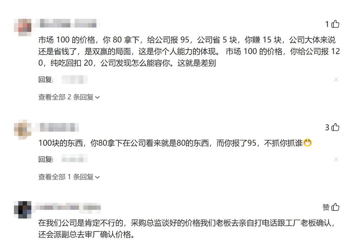"在市场价100元的情况下,如果你能以80元的价格拿下商品,然后向公司报价95元,公司节省了5元,而你则赚取了15元的差价。从表面上看,这似乎是一个双赢的局面,体现了你的个人能力。然而,如果市场价是100元,你却向公司报价120元,纯粹是为了吃回扣20元,这样的行为一旦被公司发现,必然无法容忍。这就是两者之间的本质差别。"一位网友如此评论道。 通常情况下,公司与公司之间的交易是通过公对公账户进行的,而采购人员若想从中获利,可能会通过私人对私人的账户转账,甚至直接收取现金。当然,这一切的前提是采购的单价仍然比其他供应商低,或者性价比更高。然而,尽管如此,采购吃回扣的现象仍然屡见不鲜。 让我们听听另一位网友的看法 有网友举了一个生动的例子:"你有开车经验吗?在马路上,撞车往往是最便宜的解决方案,因为只要不碰到护栏、路灯或路牙子等公共设施,赔偿就会相对较少。"这个比喻真是让人恍然大悟,形象地揭示了采购吃回扣的风险与代价。 确实,如果采购价格远高于市场行情价,那么被发现只是迟早的事。 再来看这位网友的分享 深入分析后,我们发现采购吃回扣被揭露的情况,八成并非公司内部人员主动发现,而是供应商故意为之。毕竟,转账需要账号和姓名,出错的可能性极小,除非双方之间存在矛盾或摩擦。 也有可能领导早已察觉到采购的蛛丝马迹,或者老板知道采购的产品价格偏高,直接与供应商取得联系,从而揭露了这一行为。毕竟,供应商怎么可能轻易拥有老板的私人账户信息呢? 还有这位网友的独到见解 基本常见的情况都被一一列举了,采购吃回扣的方式无非也就那么几种。其中,大多数情况是供应商举报,即供应商与对接的采购人员产生了矛盾或利益冲突。 最后,听听这位网友的爆料 "我们公司2012年有个采购人员被送进了监狱,涉案金额高达近1000万元。这个采购人员平时并不显眼,上班骑电动车,穿着也很普通。他是怎么被发现的呢?原来,他弄到钱后在外面又找到了新的感情,打算与老婆离婚,而且房和钱都不准备分给老婆。他老婆一气之下直接到我们公司闹事,从而揭露了他的罪行。" 大家身边有没有遇到过采购吃回扣被发现的奇葩事情呢? 欢迎在评论区留言讨论,分享你的所见所闻! |