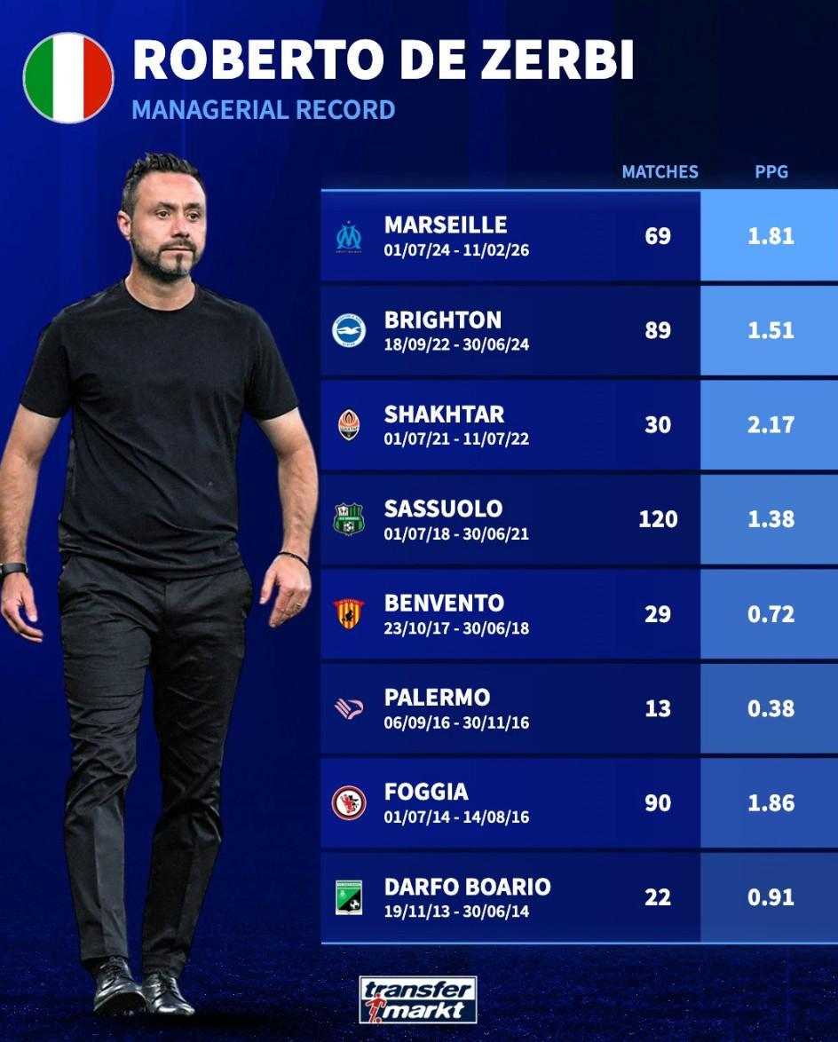 北京时间3月31日消息,随着德泽尔比被传即将成为托特纳姆热刺新任主帅,徽声在线根据权威数据平台统计,梳理了这位意大利战术大师执教生涯各阶段的场均积分表现。数据显示,其执教顿涅茨克矿工期间创造的2.17分场均积分仍为个人最高纪录,而近期执教马赛的1.81分则呈现显著上升趋势。 德泽尔比执教生涯场均积分全解析: 马赛时期(2024.7.1-2026.2.11) 布莱顿时期(2022.9.18-2024.6.30) 顿涅茨克矿工时期(2021.7.1-2022.7.11) 萨索洛时期(2018.7.1-2021.6.30) 贝内文托时期(2017.10.23-2018.6.30) 巴勒莫时期(2016.9.6-2016.11.30) 福贾时期(2014.7.1-2016.8.14) 达尔富时期(2013.11.19-2014.6.30) 【独家观赛指南:上咪咕视频解锁英超全场景直播】 |
