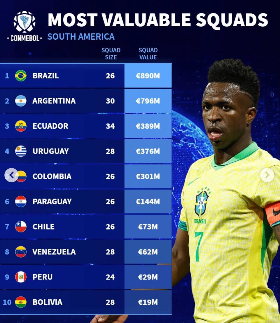 北京时间3月31日,知名转会数据网站德国转会市场(德转)公布了最新一期3月国际比赛日期间南美洲各国国家队的总身价排行榜。在这份备受瞩目的榜单中,巴西队以高达8.9亿欧元的总身价傲视群雄,稳居榜首;阿根廷队则以7.96亿欧元的总身价紧随其后,位列第二;而厄瓜多尔队则凭借3.89亿欧元的总身价成功跻身前三,成为本次榜单的一大亮点。