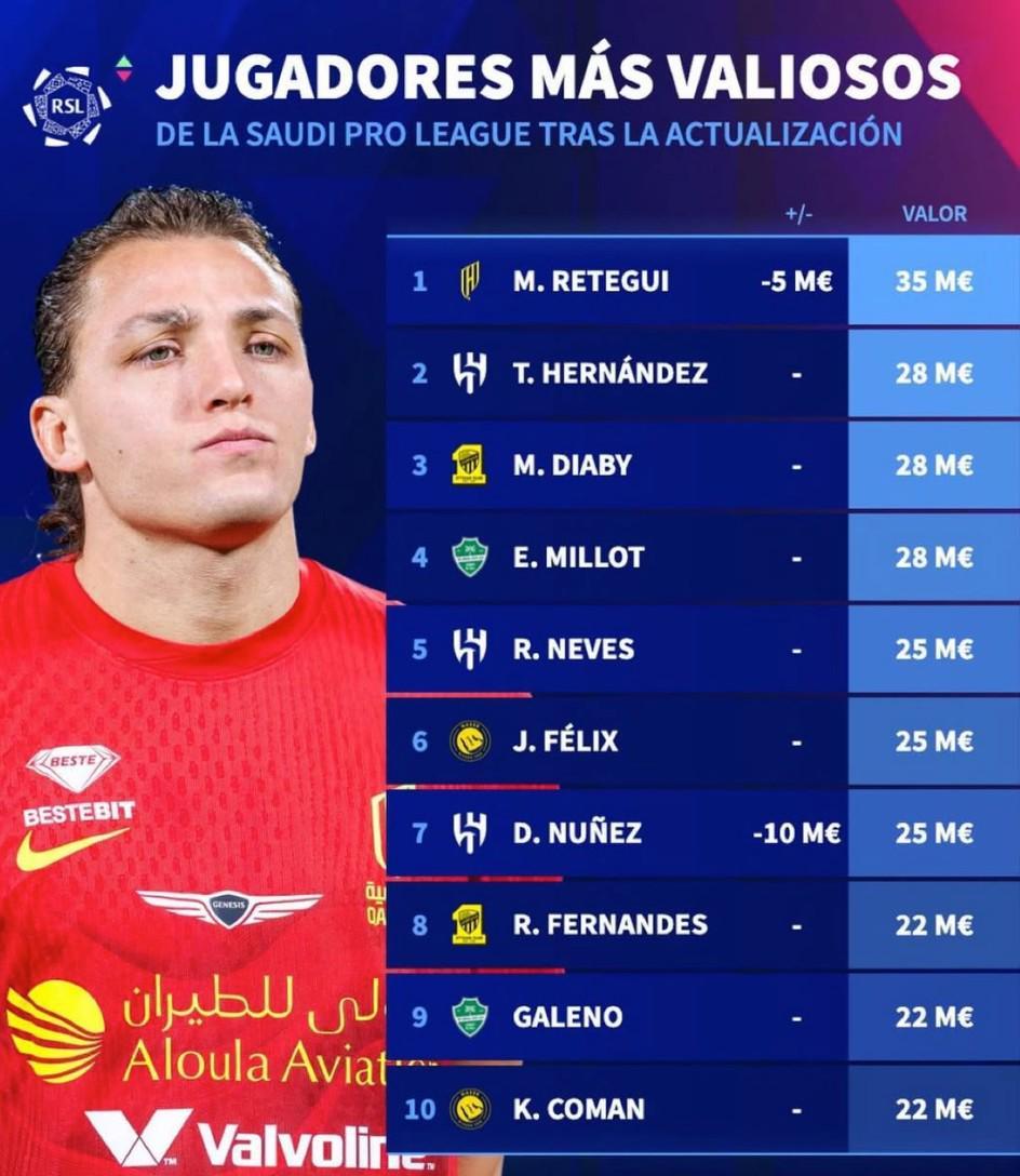 北京时间3月31日消息,随着沙特联赛在全球范围内的影响力持续攀升,球员身价数据也迎来新一轮更新。根据权威转会市场网站(德转)最新公布的沙特联赛球员身价榜单,胡拜尔库迪西亚俱乐部的意大利锋线新星雷特吉以3500万欧元领跑全联盟,其身价较上期虽下调500万欧元,但仍稳居榜首位置。利雅得新月、吉达联合等豪门球队的多名球星紧随其后,形成激烈的身价竞争格局。 德转沙特联赛球员身价TOP10详细解析: 1. 雷特吉(胡拜尔库迪西亚)3500万欧元(-500万) 2. 特奥-埃尔南德斯(利雅得新月)2800万欧元 3. 穆萨-迪亚比(吉达联合)2800万欧元 4. 米约(吉达国民)2800万欧元 5. 鲁本-内维斯(利雅得新月)2500万欧元 6. 菲利克斯(利雅得胜利)2500万欧元 7. 努涅斯(利雅得新月)2500万欧元(-1000万) 8. 罗热-费尔南德斯(吉达联合)2200万欧元 9. 加莱诺(吉达国民)2200万欧元 10. 金斯利-科曼(利雅得胜利)2200万欧元 |