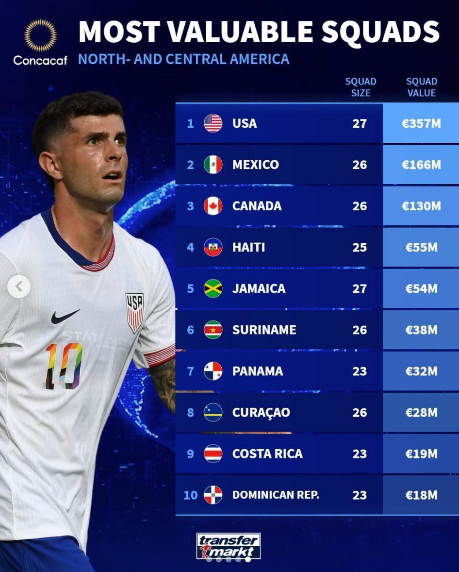 北京时间3月31日,徽声在线根据德国转会市场(德转)最新数据,整理出3月国际比赛日期间北美洲各国国家队球员总身价排行榜。值得关注的是,作为2026年世界杯联合主办国的美国、墨西哥和加拿大包揽前三,而中国男足在近期热身赛中战胜的库拉索队以2800万欧元位列第八。 北美洲国家队身价TOP10详细榜单: 1. 美国国家队:27名球员总身价达3.57亿欧元,阵容中包含普利西奇、麦肯尼等多位效力于欧洲五大联赛的球星,身价构成显示其进攻线占比最高。 2. 墨西哥国家队:26人阵容总估值1.66亿欧元,虽然整体身价位居次席,但球队拥有洛萨诺等顶级边锋,中场实力尤为突出。 3. 加拿大国家队:26名国脚总身价1.30亿欧元,凭借戴维斯、戴维等新生代球星的崛起,成为中北美地区最具潜力的球队。 4. 海地国家队:25人阵容估值5500万欧元,作为加勒比海地区劲旅,其防守体系在区域赛事中表现稳健。 5. 牙买加国家队:27名球员总身价5400万欧元,球队以速度型边路进攻著称,多名球员在英冠联赛效力。 6. 苏里南国家队:26人总估值3800万欧元,虽然国际排名不高,但阵中拥有范戴克等荷甲联赛主力球员。 7. 巴拿马国家队:23人阵容身价3200万欧元,作为2018年世界杯参赛队,其防守反击战术颇具威胁。 8. 库拉索国家队:26名球员总身价2800万欧元,在3月23日热身赛中0-2不敌中国队,其阵容以荷乙联赛球员为班底。 9. 哥斯达黎加国家队:23人总估值1900万欧元,作为2014年世界杯黑马,目前处于新老交替阶段。 10. 多米尼加国家队:23人阵容身价1800万欧元,虽然国际赛事经验较少,但青年才俊储备值得关注。 |