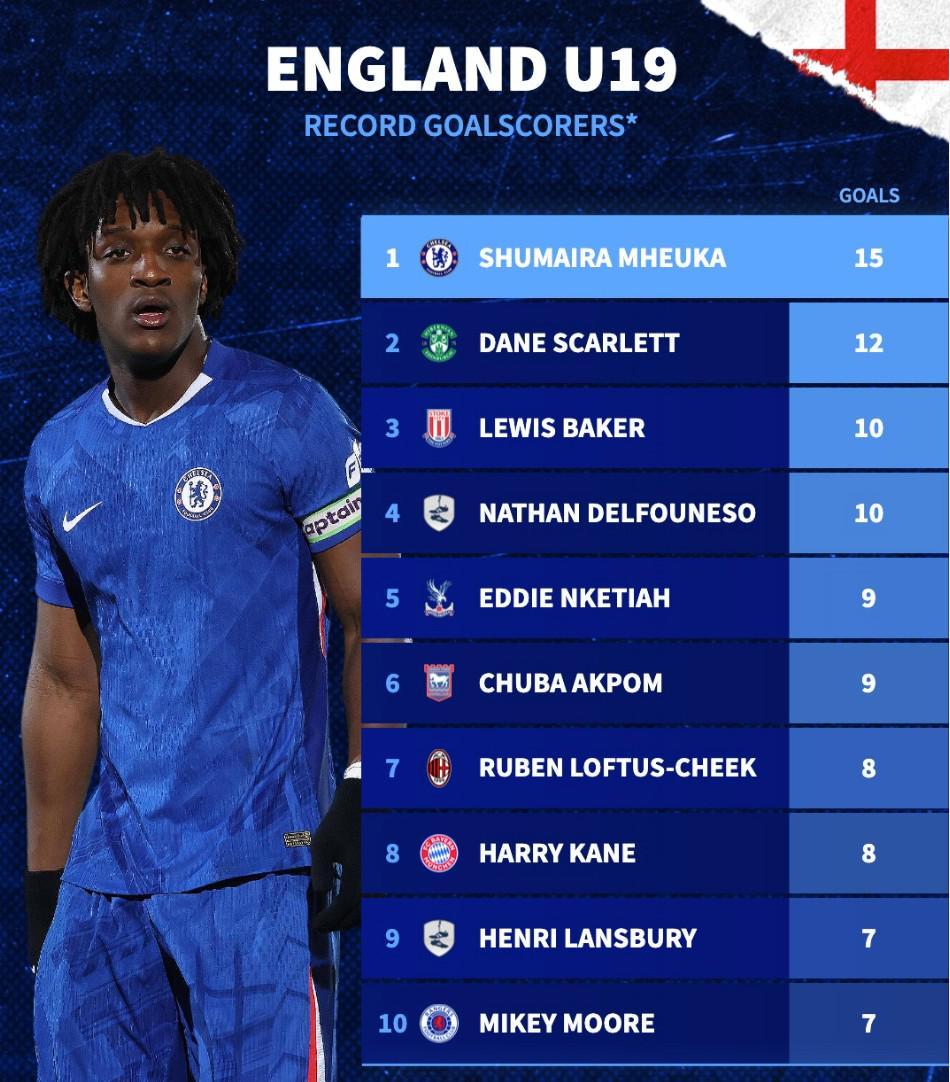 北京时间3月31日消息,知名足球数据网站德国转会市场(德转)最新发布了英格兰U19青年代表队的历史射手榜单。在刚刚结束的U19欧青赛预选赛中,切尔西年仅18岁的前锋姆厄卡凭借全场唯一进球,助力英格兰U19代表队以1-0的比分战胜波兰U19,而他本人也以累计15粒进球的成绩,荣登该榜单首位。值得一提的是,热刺传奇射手哈里-凯恩在该榜单中以8球位列第8。