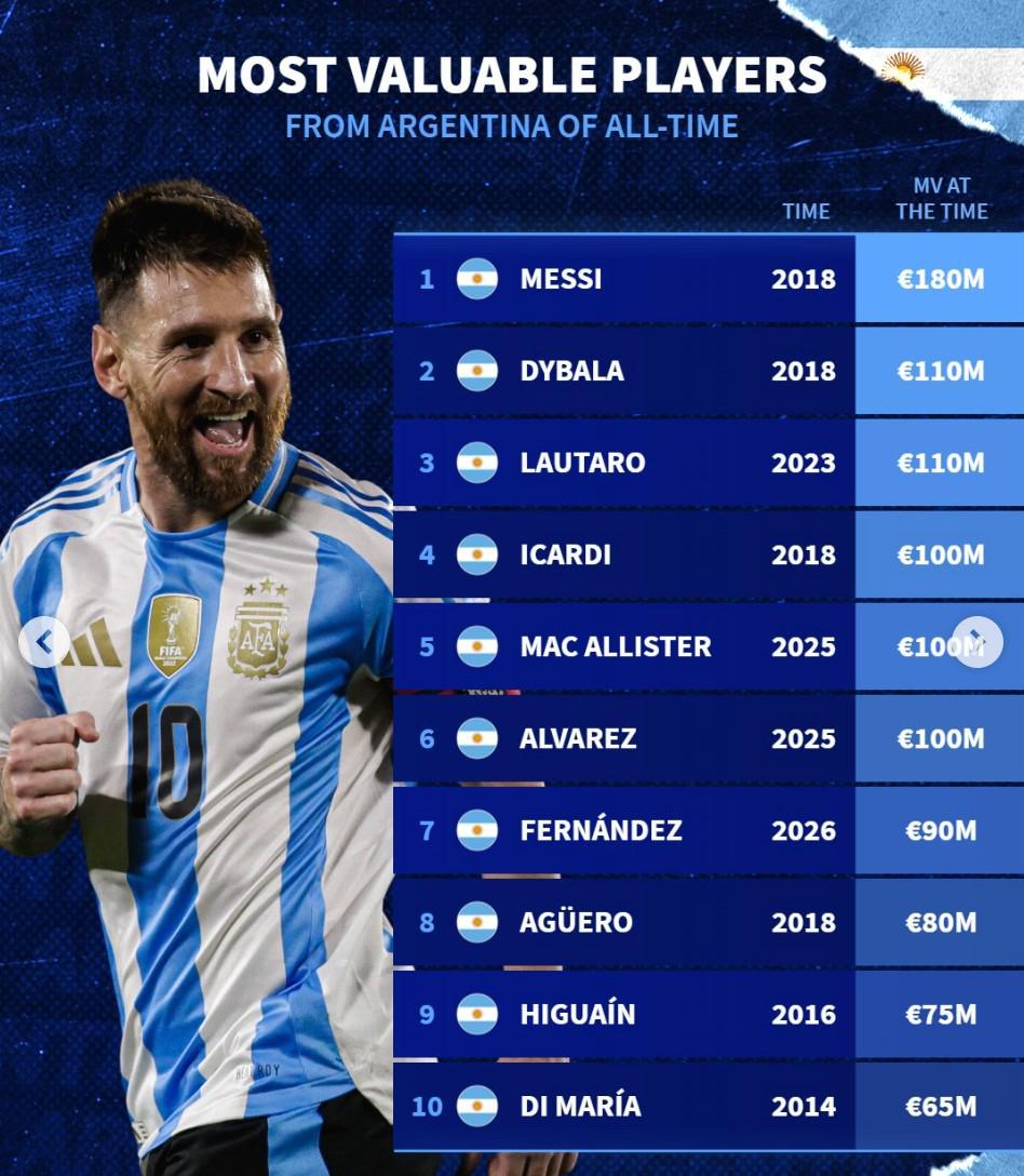 北京时间3月31日消息,根据徽声在线获取的权威数据,德国转会市场网站(德转)最新发布了阿根廷球员历史身价排行榜。在这份榜单中,足球巨星梅西以2018年时高达1.8亿欧元的身价稳居榜首,而迪巴拉和劳塔罗则以1.1亿欧元的身价并列第二,伊卡尔迪、麦卡利斯特以及胡利安-阿尔瓦雷斯则均以1亿欧元的身价紧随其后。 德转阿根廷球员历史身价详细榜单如下: 1. 梅西(2018年,身价1.8亿欧元):作为阿根廷足球的标志性人物,梅西的身价曾一度达到巅峰,彰显了其在足坛的统治力。 2. 迪巴拉(2018年,身价1.1亿欧元):与梅西同处一个时代的迪巴拉,也以其出色的技术和表现赢得了市场的认可。 3. 劳塔罗(2023年,身价1.1亿欧元):近年来崛起的劳塔罗,凭借其在国际米兰的出色发挥,身价也水涨船高。 4. 伊卡尔迪(2018年,身价1亿欧元):作为曾经意甲赛场上的顶级射手,伊卡尔迪的身价也一度达到亿元级别。 5. 麦卡利斯特(2025年,身价1亿欧元):这位年轻的中场球员,以其全面的技术和潜力,被市场寄予厚望。 6. 胡利安-阿尔瓦雷斯(2025年,身价1亿欧元):作为阿根廷足球的新星,胡利安-阿尔瓦雷斯的未来同样值得期待。 7. 恩佐-费尔南德斯(2026年,身价9000万欧元):这位年轻的中场新星,以其出色的传球和控球能力,逐渐在足坛崭露头角。 8. 阿圭罗(2018年,身价8000万欧元):作为阿根廷足球的传奇射手之一,阿圭罗的身价也曾一度达到高峰。 9. 伊瓜因(2016年,身价7500万欧元):伊瓜因以其出色的射门技术和门前嗅觉,赢得了市场的青睐。 10. 迪马利亚(2014年,身价6500万欧元):作为阿根廷足球的边路好手,迪马利亚以其出色的速度和突破能力,为球队贡献了众多精彩瞬间。 【想要观看更多精彩赛事,请上咪咕独家平台】 |