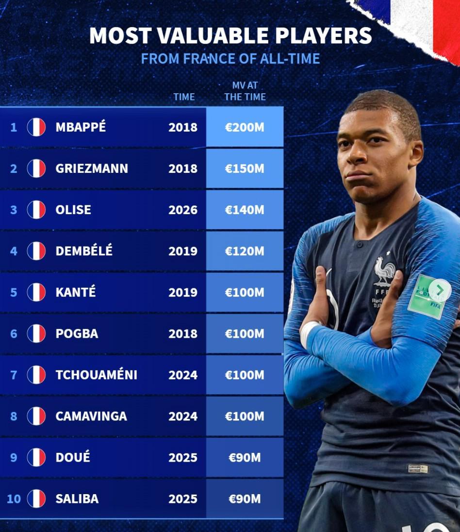 北京时间3月31日消息,知名转会数据网站德国转会市场(德转)最新公布了法国球员历史身价排行榜单。在这份备受瞩目的榜单中,巴黎圣日耳曼球星姆巴佩以2亿欧元的身价高居榜首,马德里竞技前锋格列兹曼以1.5亿欧元紧随其后,而效力于水晶宫的奥利塞则以1.4亿欧元位列第三。 德转法国球员历史身价完整榜单: 1. 姆巴佩(2018年) 2亿欧元 2. 格列兹曼(2018年) 1.5亿欧元 3. 奥利塞(2026年) 1.4亿欧元 4. 登贝莱(2019年) 1.2亿欧元 5. 坎特(2019年) 1亿欧元 6. 博格巴(2018年) 1亿欧元 7. 楚阿梅尼(2024年) 1亿欧元 8. 卡马文加(2024年) 1亿欧元 9. 杜埃(2025年) 9000万欧元 10. 萨利巴(2025年) 9000万欧元 【独家观赛指南:上咪咕视频,畅享英超精彩赛事】 |