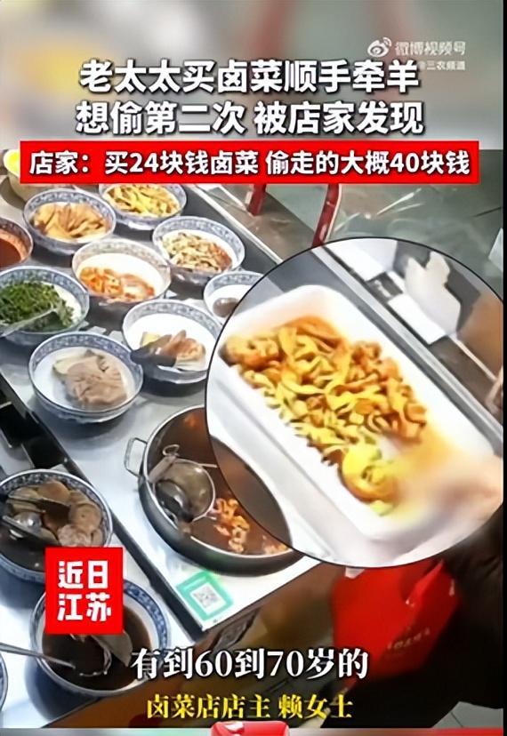 近日,在江苏无锡发生了一起引人关注的事件:一位年约六七十岁的老人在一家卤菜店内,趁着店主正忙着为其他顾客盛装卤菜时,分两次悄悄将桌上的卤肉装进了自己的口袋。 据店主赖女士回忆,她是在老人第二次动手时才有所察觉,但当时并未立即意识到是丢失了物品。直到老人离开店铺后,赖女士在清点货物时才发现,这位老人虽然只支付了24元的卤菜费用,却额外拿走了价值40多元的大肠头。 |