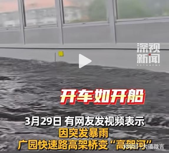 最近,广州的市民们着实体验了一把别开生面的"水陆两栖"出行方式! 就在3月29日的午后时分,广州的天空骤然间变得昏暗无比,白昼瞬间仿佛被黑夜吞噬。 紧接着,一场倾盆大雨毫无预兆地降临,短短几个回合,广园快速路上的高架桥便摇身一变,成了名副其实的"高架河"。 浏览网络上的视频,那场景简直如同科幻电影一般,令人叹为观止。 桥面上的积水深不可测,足以淹没半个车轮,行驶其上,水波荡漾,宛如在大海中航行。 一位司机大哥在驾驶过程中不禁自言自语:“我这究竟是在开车,还是在驾船呢?” 网友们也是创意无限,纷纷留言调侃:“在城里开车,竟然开出了乘风破浪的感觉!”“下班回家,愣是把通勤之路变成了惊险刺激的漂流之旅!”