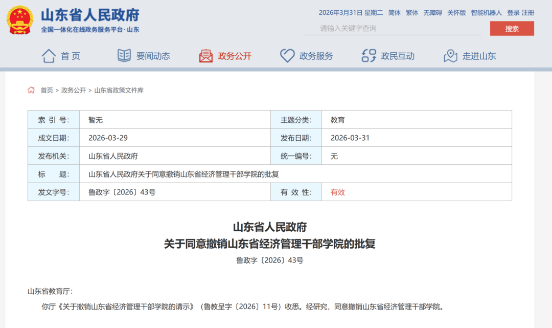根据山东省政府官方网站于3月31日公布的信息,《山东省人民政府关于同意山东省经济管理干部学院撤销的批复》已正式发布。 山东省人民政府 关于山东省经济管理干部学院撤销事宜的批复 文件编号:鲁政字〔2026〕43号 致山东省教育厅: 贵厅提交的《关于请求撤销山东省经济管理干部学院的请示》(文件编号:鲁教呈字〔2026〕11号)已获悉。经过慎重研究与审议,现正式批复同意对山东省经济管理干部学院进行撤销。 山东省人民政府 发布日期:2026年3月29日 |