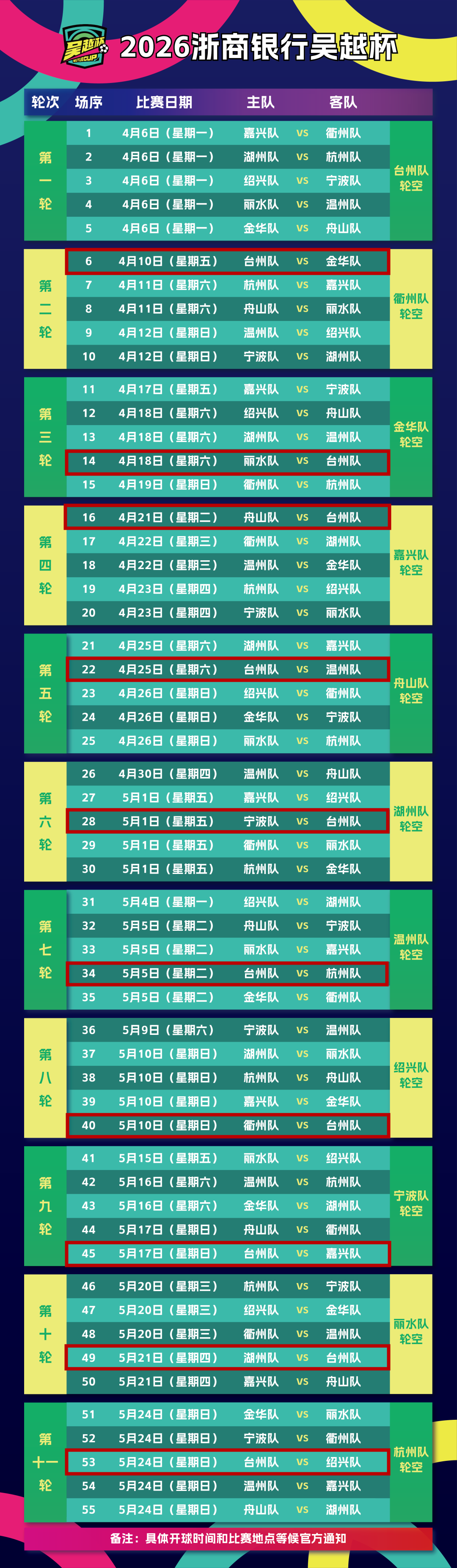 从4月6日开始,备受瞩目的2026年浙江省城市足球联赛“吴越杯”即将在全省11座城市激情开战,一场场精彩绝伦的足球盛宴即将轮番上演。 就在今日,完整的赛程安排终于新鲜出炉。此次赛事共计62场比赛,时间跨度从4月6日一直持续到6月11日。共有11支代表各自家乡的战队参与角逐,比赛采用主客场单循环积分赛制,每支球队都将拥有5个主场和5个客场的比赛机会。在积分赛结束后,排名前八的球队将晋级淘汰赛阶段,淘汰赛采用单场决胜的方式,直至最终冠军的诞生。 揭幕战亮点 4月6日,嘉兴队将在主场迎来衢州队的挑战,这场比赛将作为“吴越杯”的揭幕战,正式打响本次赛事的第一枪,相信会吸引众多球迷的目光。 独特的轮空赛制 为了确保比赛的合理性和各球队的充分调整,本次赛事特别设置了轮空赛制。每一轮比赛中都会有一支球队轮空,赛程表中已经对此进行了明确标注,这样的安排有助于各队根据自身情况合理调整比赛节奏和战术安排。 淘汰赛阶段详情