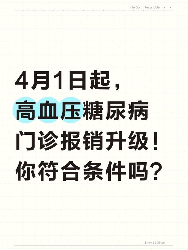缴纳医保多年,可慢性病患者在购买药品时,是否总觉得报销力度不够理想? 高血压、糖尿病患者需要长期依赖药物控制病情,门诊费用带来的经济压力一直不容小觑,对吧? 好消息来啦!从2026年4月1日起,全国范围内将统一实施门诊慢特病管理新政策, 这一政策将在报销比例、额度以及办理门槛等方面进行全面优化调整,符合条件的患者每年可节省数千元开支。 然而,目前仍有许多人对这些政策变化知之甚少,继续按照旧有方式就医购药,无形中多花了不少冤枉钱。 今天,徽声在线将用通俗易懂的语言,结合真实数据,为您深入剖析新政策:哪些人可以申请、如何申请、能节省多少费用, 让您一目了然,轻松对照办理,真正享受到政策带来的实惠。 一、慢病门诊报销的难题:过去为何难以省钱? 据统计,我国高血压患者数量已超过3.3亿,糖尿病患者也超过1.4亿, 其中,超过80%的患者需要长期门诊服药并定期复查, 然而,过去的报销规则却让这部分人群长期处于保障不足的困境中。 以往,办理慢病认定时,许多地区要求患者必须提供住院病历, 但多数慢病患者病情稳定,仅需门诊治疗,从未住院, 因此,他们直接被挡在了慢病保障的大门之外,只能按照普通门诊的标准进行报销。 普通门诊报销存在诸多不足: 起付线普遍在200元以上,只有超过这个金额的部分才能报销; 报销比例大多在50%左右,即使在基层医院也仅能达到60%-70%; 年度报销额度偏低,高血压患者多为500元/年,糖尿病患者为800元/年, 一个季度的药费就可能用完额度,后续费用只能全额自费。 同时,过去一次开药仅限7天,患者一年需往返医院10次以上, 对于老年人和上班族来说,这无疑增加了时间成本和交通成本。 这些问题叠加在一起,导致慢病患者实际报销比例低,经济负担重。 二、2026新政三大亮点:从“难办”到“好报”的转变 2026年4月1日即将实施的《全国统一门诊慢特病管理规范(2026版)》, 针对以往存在的痛点进行了精准调整,三大变化将直接降低患者的经济负担。 1. 办理门槛降低:无需住院病历即可申请 新政策明确规定,门诊诊断证明与住院病历具有同等法律效力, 只要患者在二级及以上医院确诊,并提供近3-6个月的检查报告和长期用药处方, 即可申请慢病认定,无需再为住院记录而奔波。 这一调整使得数千万仅靠门诊治疗的慢病患者, 首次被纳入慢病保障范围,覆盖人群大幅扩大。 同时,审核流程也得到了简化,线上线下均可办理,最快3个工作日内即可出结果, 次月生效,无需再等待漫长的审批过程。 2. 报销力度提升:比例、额度双增长 新政策取消或大幅降低了起付线,部分地区甚至实现了“零起付”, 即门诊费用可直接报销,不再设置报销门槛。 报销比例也得到了显著提高: 基层医疗机构(如社区医院、乡镇卫生院)的报销比例最高可达95%, 二级医院为75%-85%,三级医院为65%-75%; 退休人员在此基础上,报销比例再上浮3-5个百分点。 年度报销额度也实现了翻倍增长: 高血压患者的年度限额不低于800元,糖尿病患者不低于1200元, 同时患有两种及以上慢病的患者,额度可累加使用, 部分地区职工医保的额度更高,最高可达2000元/年。 3. 就医便利升级:一次开药最长可达12周 针对开药频繁的问题,新政策规定, 病情稳定的慢病患者,一次可开具最长12周(即3个月)的药量, 这样,患者一年仅需往返医院4次,大大减少了跑腿次数, 节省了时间和交通成本,尤其方便了老年人和行动不便的人群。 三、量化算账:新政前后能节省多少费用? 以常见的高血压患者为例,假设其月均药费为300元,年药费则为3600元, 对比新政前后的报销情况,差距一目了然。 新政前(按照普通门诊报销标准) 起付线为200元,报销比例为50%,年度限额为500元; 可报销金额=(3600-200)×50%=1700元,但受年度限额限制, 实际仅能报销500元,个人需自付3100元。 新政后(按照慢病保障报销标准) 以基层医院90%的报销比例、无起付线计算, 可报销金额=3600×90%=3240元,个人仅需自付360元; 一年节省的费用=3100-360=2740元。 若为职工医保,基层医院的报销比例可达95%, 可报销金额=3600×95%=3420元,个人仅需自付180元, 一年可节省3420元。 居民医保按照75%的比例报销,可报销2700元,个人需自付900元, 一年可节省2200元。 若患者同时患有糖尿病,年度额度可累加后, 节省的金额可突破4000元,且检查费、并发症用药也纳入报销范围, 实际减负效果更加明显。 四、办理流程:三步轻松搞定,线上线下都便捷 1. 准备材料 身份证、社保卡(或医保电子凭证); 二级及以上医院开具的慢病诊断证明(需在有效期内); 近3-6个月的血压、血糖检查报告; 长期用药处方(需符合医保目录)。 2. 提交申请 线上申请:通过“国家医保服务平台”APP、微信/支付宝医保小程序, 进入“门诊慢特病认定”入口,上传相关材料即可; 线下申请:前往社区卫生服务中心、定点医院医保窗口, 工作人员将协助您办理,无需复杂操作。 3. 审核生效 审核周期一般为3-7个工作日,通过后次月生效, 无需办理实体慢病卡,医保电子凭证全国通用, 在定点医院、药店直接刷卡结算,即可自动报销。 五、注意事项:这些细节影响报销效果 1. 诊断证明、检查报告需在有效期内,过期需重新开具; 2. 仅定点医疗机构、定点药店的费用可报销,非定点机构不纳入报销范围; 3. 用药需符合医保目录,目录外药品需全额自费; 4. 异地就医需提前备案,否则无法直接结算; 5. 