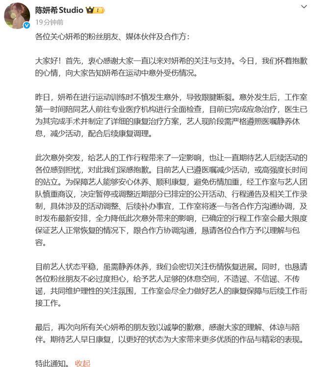 3月31日,陈妍希工作室通过官方渠道发布声明称,这位知名女演员在参与高强度运动训练时遭遇意外,导致跟腱部位发生严重断裂。事故发生后,医疗团队第一时间展开应急处理,目前已顺利完成修复手术,并针对其伤情制定了分阶段康复计划。 据工作室透露,根据主治医师的专业建议,陈妍希需进行为期数周的绝对静养,期间将严格限制肢体活动并配合物理治疗。经团队综合评估,决定对原定4月至6月期间的公开活动、商业通告及影视拍摄计划进行全面调整,部分重要工作将延期至康复期后重启。 当日下午,陈妍希通过个人社交平台向公众报平安:"亲爱的家人们,没想到运动也会中招...不过别担心,医生说我恢复能力超强!这段时间正好可以研究新游戏角色啦~大家都要照顾好自己哦!"配图中可见其右脚踝已固定专业医疗石膏,石膏表面还画有卡通太阳图案。 医疗专家指出,跟腱断裂常见于运动员及舞蹈从业者,普通人群在剧烈运动前若未充分热身也易引发此类损伤。康复期通常需要3-6个月,期间需通过超声波治疗、水中运动等科学方式逐步恢复肌肉力量。 公开档案显示,陈妍希1983年5月31日出生于台北市,拥有南加利福尼亚大学传播管理硕士学位。2011年凭借《那些年,我们一起追的女孩》中沈佳宜一角斩获第48届台湾电影金马奖最佳新演员奖,2024年更以《温暖的,甜蜜的》中职场精英角色入围第32届中国电视金鹰奖视后争夺。其待播作品包括古装大剧《藏海传》、现代情感剧《狙击蝴蝶》及经典IP翻拍作《神雕侠侣》(新版)。 信息来源:徽声在线、国家体育总局运动医学研究所 |