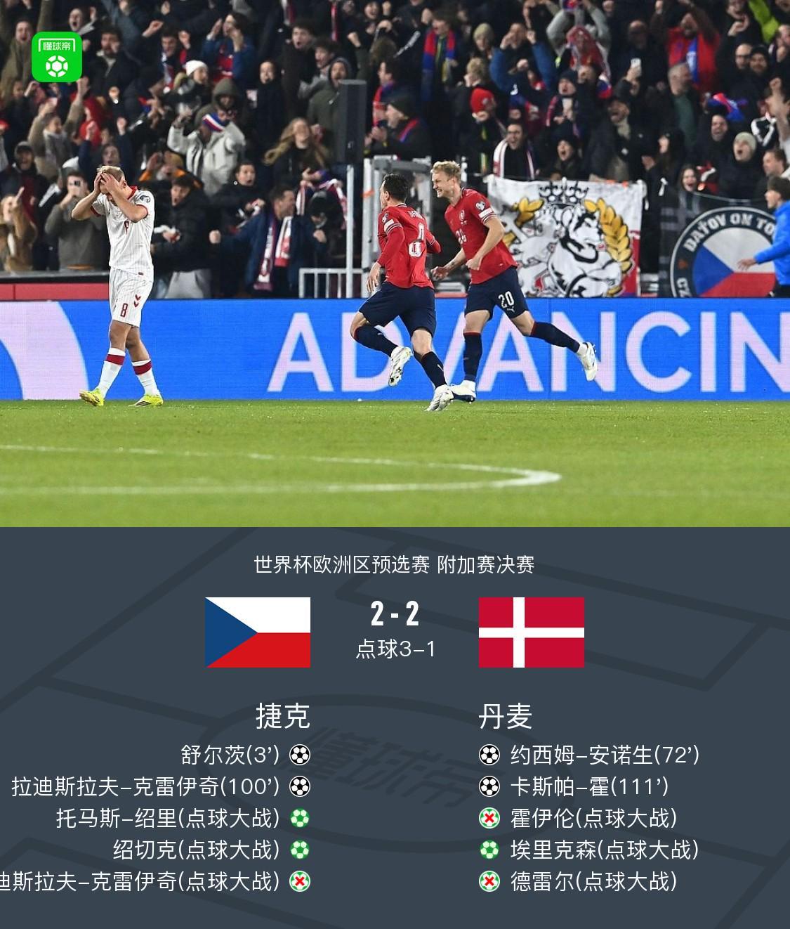 在4月1日进行的世界杯欧洲区预选赛附加赛决赛中,捷克队与丹麦队展开了一场惊心动魄的对决。捷克队凭借舒尔茨和拉迪斯拉夫-克雷伊奇的出色发挥成功破门,而丹麦队则由约西姆-安诺生和卡斯帕-霍扳回两城。经过激烈的角逐,最终捷克队以5-3的比分战胜丹麦队,成功晋级世界杯。 比赛关键事件回顾 开场仅3分钟,捷克队便取得梦幻开局!舒尔茨凌空抽射破门,为捷克队先拔头筹,1-0领先丹麦。 比赛进行到第72分钟,丹麦队终于抓住机会!安诺生头球破门,将比分扳平为1-1,双方重回同一起跑线。 第100分钟,捷克队再次发力!克雷伊奇在乱战中抢射破门,帮助捷克队2-1再度领先丹麦。 然而,丹麦队并未放弃。第111分钟,他们利用角球机会,由卡斯帕-霍头球破门,再次将比分扳平为2-2。