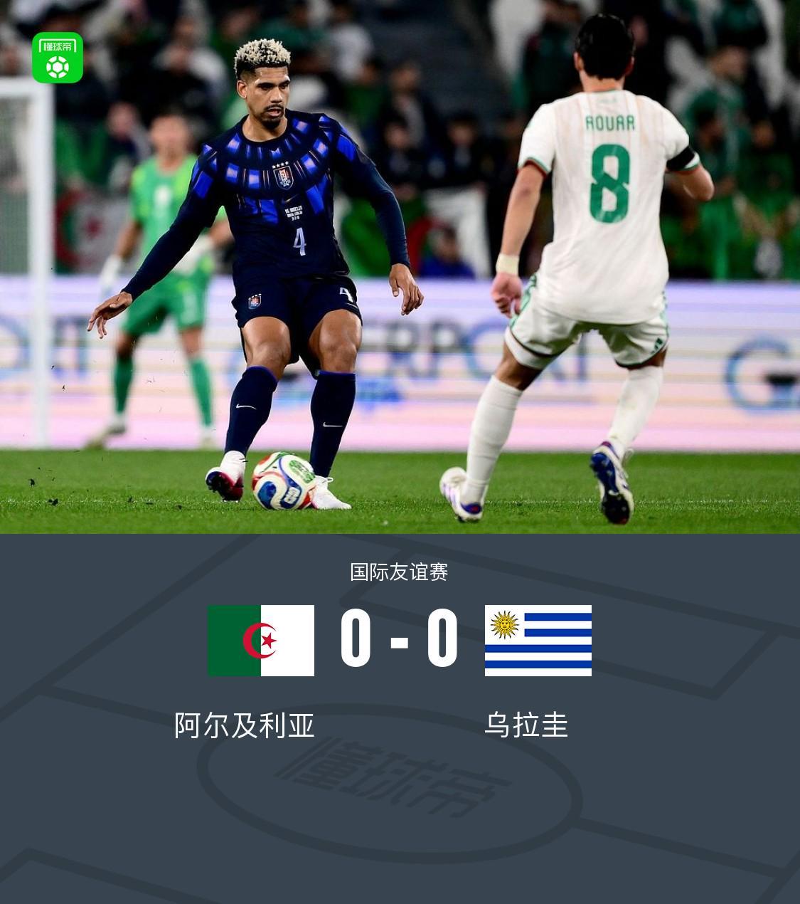 北京时间4月1日晚间,一场备受瞩目的国际友谊赛在绿茵场上展开,对阵双方是阿尔及利亚与乌拉圭。上半场赛事中,乌拉圭队的巴尔韦德展现出了不俗的进攻能力,他的一记远射颇具威胁,可惜被阿尔及利亚队的门将神勇扑出,未能改写比分。下半场,阿尔及利亚队获得了一次绝佳的破门机会,奥亚尔在点球点附近接球后直接起脚射门,然而皮球却高高飞出球门范围,错失了领先的大好时机。整场比赛,两队在进攻端都显得较为乏力,全场比赛下来总共只有1次射正,场面略显沉闷。最终,随着裁判的一声哨响,全场比赛结束,阿尔及利亚与乌拉圭以0-0的比分握手言和。 精彩回顾 赛前,双方球员在场上列队握手致意,展现了良好的体育精神,随着裁判的一声哨响,这场友谊赛正式拉开帷幕。 比赛进行到第42分钟,乌拉圭队获得了一次进攻机会,巴尔韦德在禁区外起脚远射,皮球如离弦之箭般飞向球门,可惜被阿尔及利亚队的门将反应迅速,稳稳将球扑出。 第47分钟,乌拉圭队的卡诺比奥也尝试了一脚射门,他的射门角度刁钻,可惜皮球最终击中了边网,未能形成实质性的威胁。 第54分钟,乌拉圭队获得了一次任意球机会,他们精心策划的战术配合后,乌加特头球后蹭,可惜皮球稍稍偏出了球门范围,让乌拉圭队错失了一次破门良机。 第60分钟,阿尔及利亚队也获得了一次绝佳的进攻机会,奥亚尔在点球点附近接球后直接起脚射门,然而他的射门却显得有些仓促,皮球高高飞出球门,让阿尔及利亚队的球迷们扼腕叹息。 第70分钟,乌拉圭队的比尼亚斯也尝试了一脚任意球直接攻门,他的射门力量十足,可惜皮球稍稍偏出了球门,未能为乌拉圭队打破僵局。