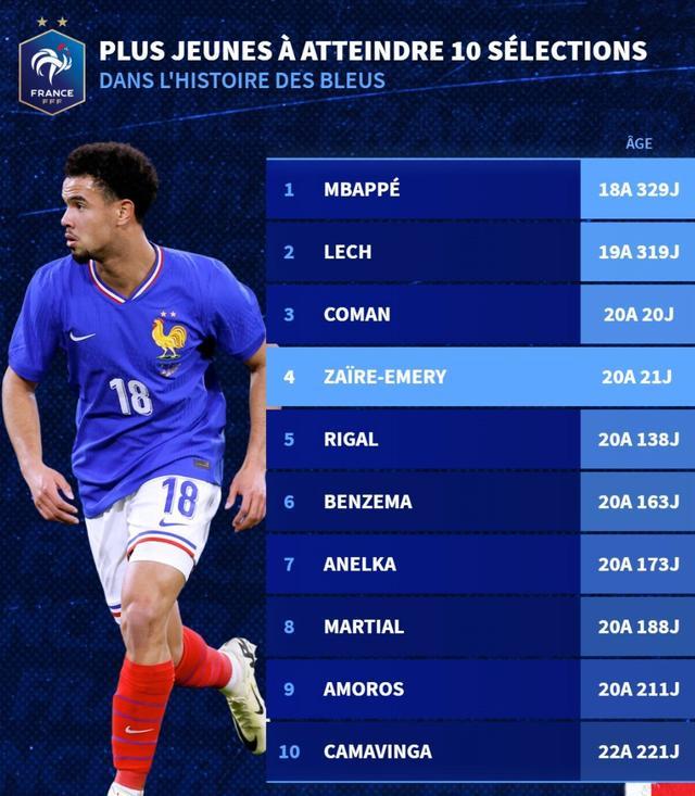 北京时间4月1日,依据权威转会数据平台德转的最新统计数据显示,巴黎圣日耳曼队的中场新星扎伊尔-埃梅里,已然成为代表法国国家队出战达到10次的历史上第四年轻的球员。 在最近一场法国队与哥伦比亚队的友谊赛中,扎伊尔-埃梅里以首发身份登场,并凭借这场比赛成功迎来了自己在法国国家队的第10次出场,这一里程碑时刻无疑为他的职业生涯增添了浓墨重彩的一笔。