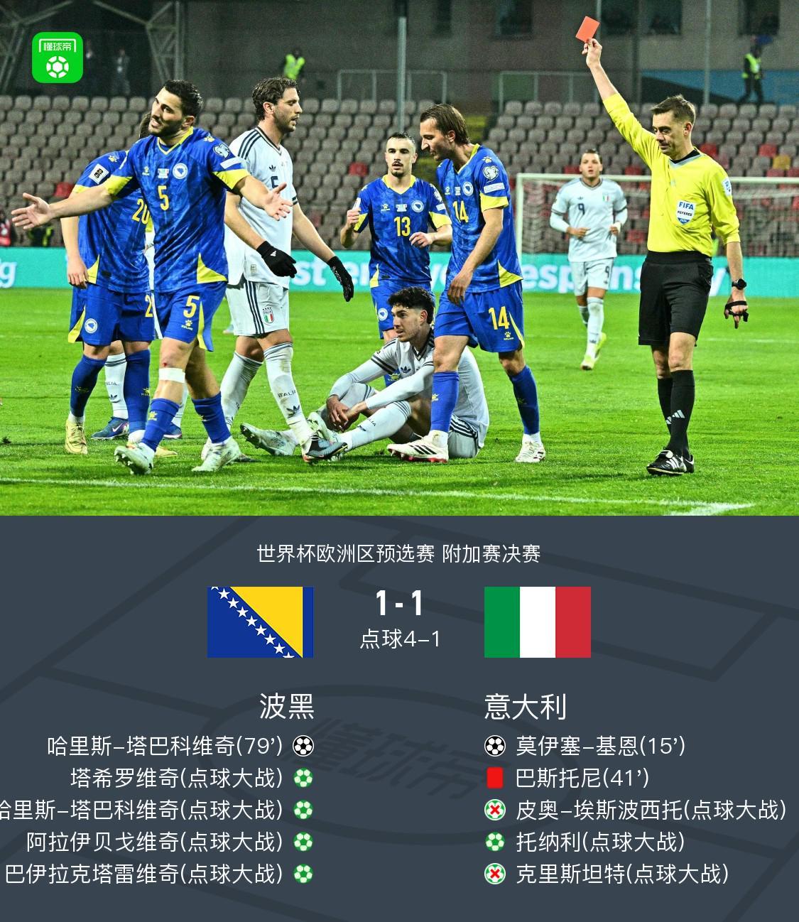 北京时间4月1日,在世界杯欧洲区预选赛附加赛决赛的激烈对决中,波黑队与意大利队展开了一场惊心动魄的较量。最终,波黑队凭借哈里斯-塔巴科维奇的出色发挥,以总比分5-2力克意大利,成功晋级世界杯,而意大利则连续三届无缘世界杯舞台,巴斯托尼更是因防线最后一人犯规直接吃到红牌。 关键事件回顾 比赛进行到第15分钟,场上风云突变,瓦西里的一次致命失误为意大利队送上了大礼。巴雷拉抓住机会,精准助攻基恩,后者推射破门,意大利队1-0取得领先,现场球迷欢呼雀跃。 然而,好景不长,第42分钟,场上形势急转直下。巴斯托尼作为防线最后一人,在铲倒梅米奇后,被裁判直接出示红牌罚下,意大利队不得不以十人应战,局势瞬间变得严峻起来。 第79分钟,场上再次掀起波澜。塔巴科维奇在混战中抓住机会,破门得分,将比分扳平为1-1。十人作战的意大利队面临巨大压力,球迷们的心也提到了嗓子眼。