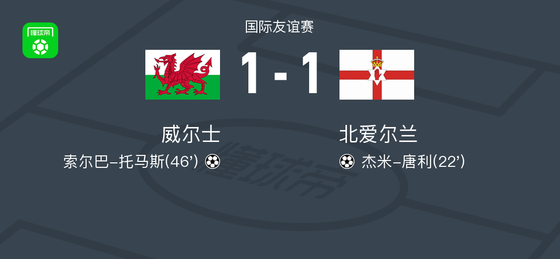 北京时间4月1日晚间,一场备受瞩目的国际友谊赛在威尔士与北爱尔兰之间展开。比赛中,双方球员都展现出了极高的竞技水平。威尔士方面,索尔巴-托马斯成为球队的功臣,他成功破门为威尔士扳平比分。而北爱尔兰的杰米-唐利同样表现出色,他的一记精彩进球让北爱尔兰一度领先。最终,经过90分钟的激战,双方以1-1的比分握手言和。