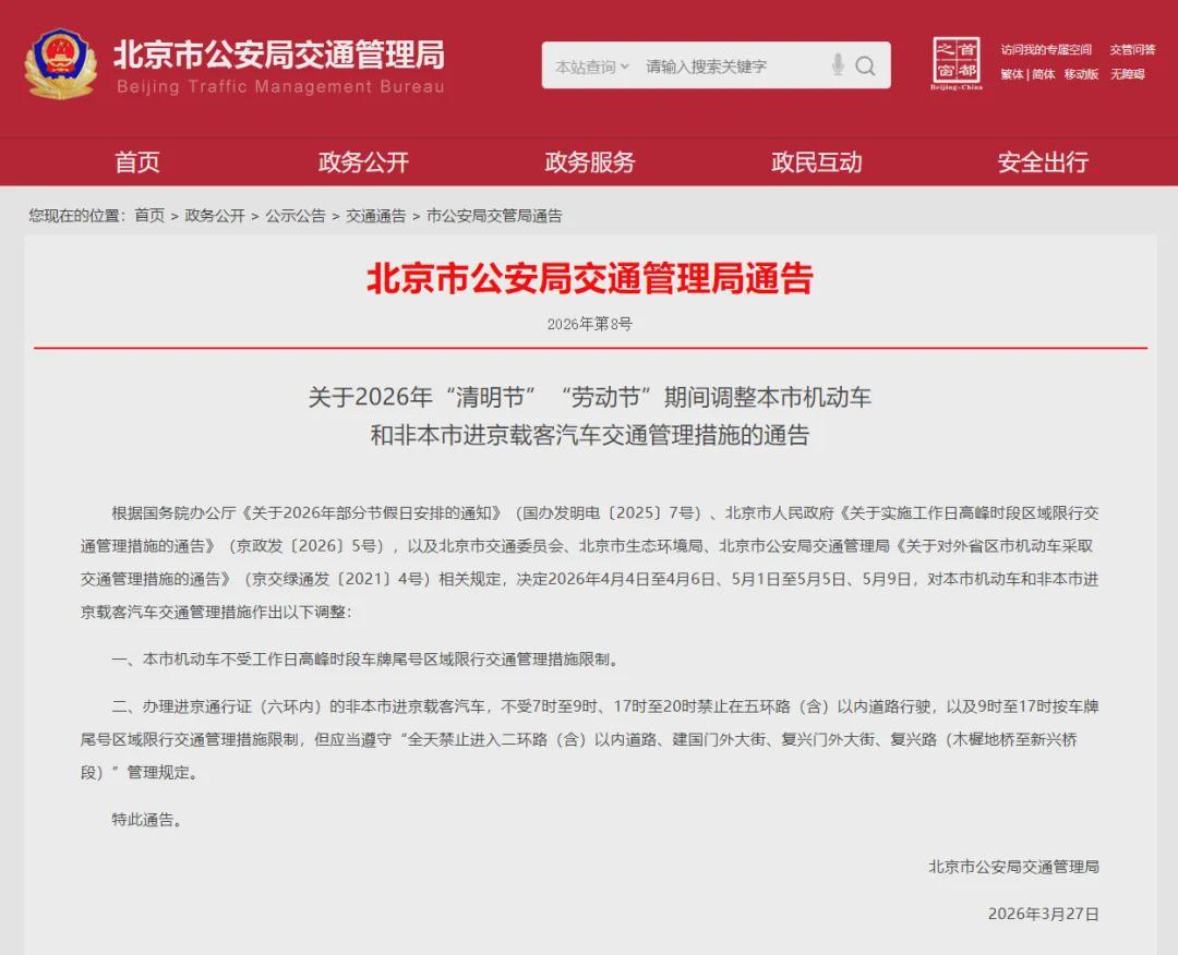 3月27日,北京市公安局交通管理局正式对外发布了《关于2026年“清明节”与“劳动节”期间本市机动车及非本市进京载客汽车交通管理措施调整的通告》。 该通告明确指出,依据相关法规要求,在2026年的4月4日至4月6日清明节假期,以及5月1日至5月5日的劳动节假期,再加上5月9日这一特殊日期,将对本市机动车和非本市进京载客汽车的交通管理措施进行如下重要调整: